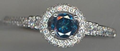 18KT WHITE GOLD ENGAGEMENT RING. 3D CLASSIC HALO DESIGN. WHITE ROUND DIAMONDS ARE F/G COLOR, VSSI CLARITY .57 CARATS. BLUE DIAMOND IS .39 CARATS. RING SIZE 7. CAN BE SIZED BY OUR MASTER JEWELER UPON REQUEST. WRITTEN APPRAISAL AVAILABLE. COMES IN A PRESENTABLE GIFT BOX.