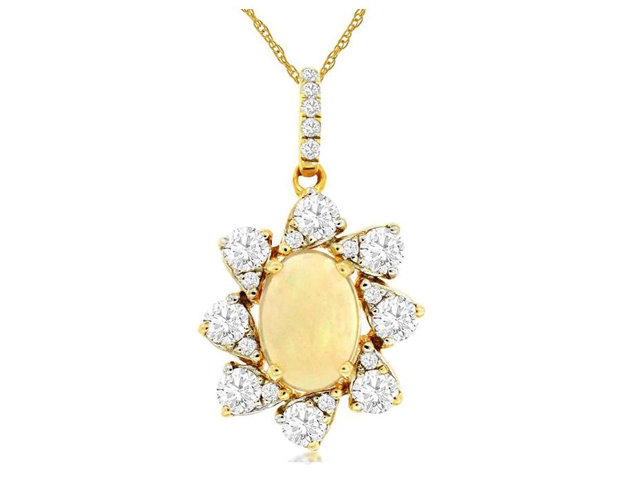 14KT YELLOW GOLD FLOATING PENDANT. 3D CLASSIC FLOWER DESIGN. ROUND DIAMONDS ARE F/G COLOR, VSSI CLARITY .47 CARATS. AAA OVAL OPAL IS .50 CARATS. COMES ON A 14KT GOLD DIAMOND CUT 18" INCH CHAIN. WRITTEN APPRAISAL AVAILABLE. COMES IN A PRESENTABLE GIFT BOX.