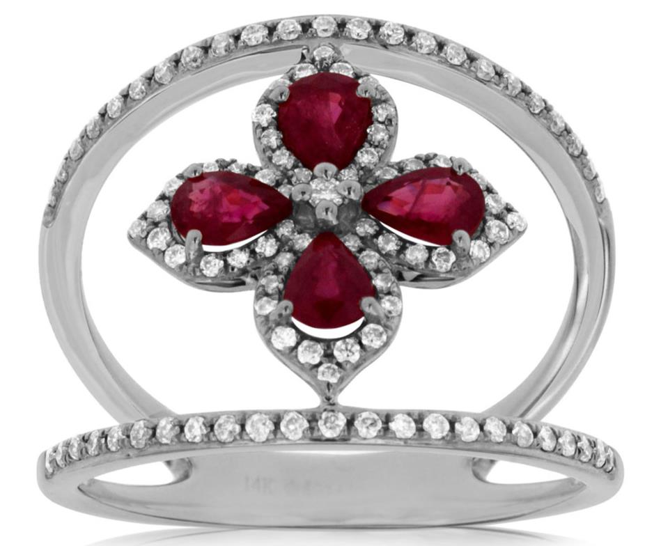 .97CT DIAMOND & AAA RUBY 14KT WHITE GOLD 3D PEAR SHAPE & ROUND FLOWER LOVE RING
