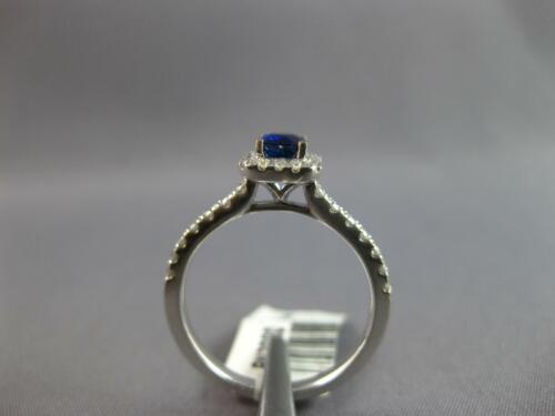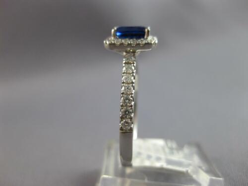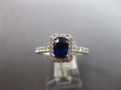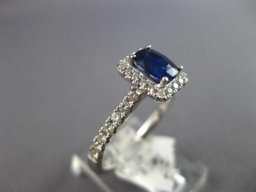 18KT WHITE GOLD ENGAGEMENT RING. 3D RECTANGULAR HALO DESIGN. ROUND DIAMONDS ARE F/G COLOR, VVS-VS CLARITY .35 CARATS. AAA CUSHION CUT SAPPHIRE IS .62 CARATS. SAPPHIRE MEASURES 6mm X 4mm. RING MEASURES 8.5mm WIDE. RING SIZE 6.5. CAN BE SIZED BY OUR MASTER JEWELER UPON REQUEST. WRITTEN APPRAISAL AVAILABLE. COMES IN A PRESENTABLE GIFT BOX.