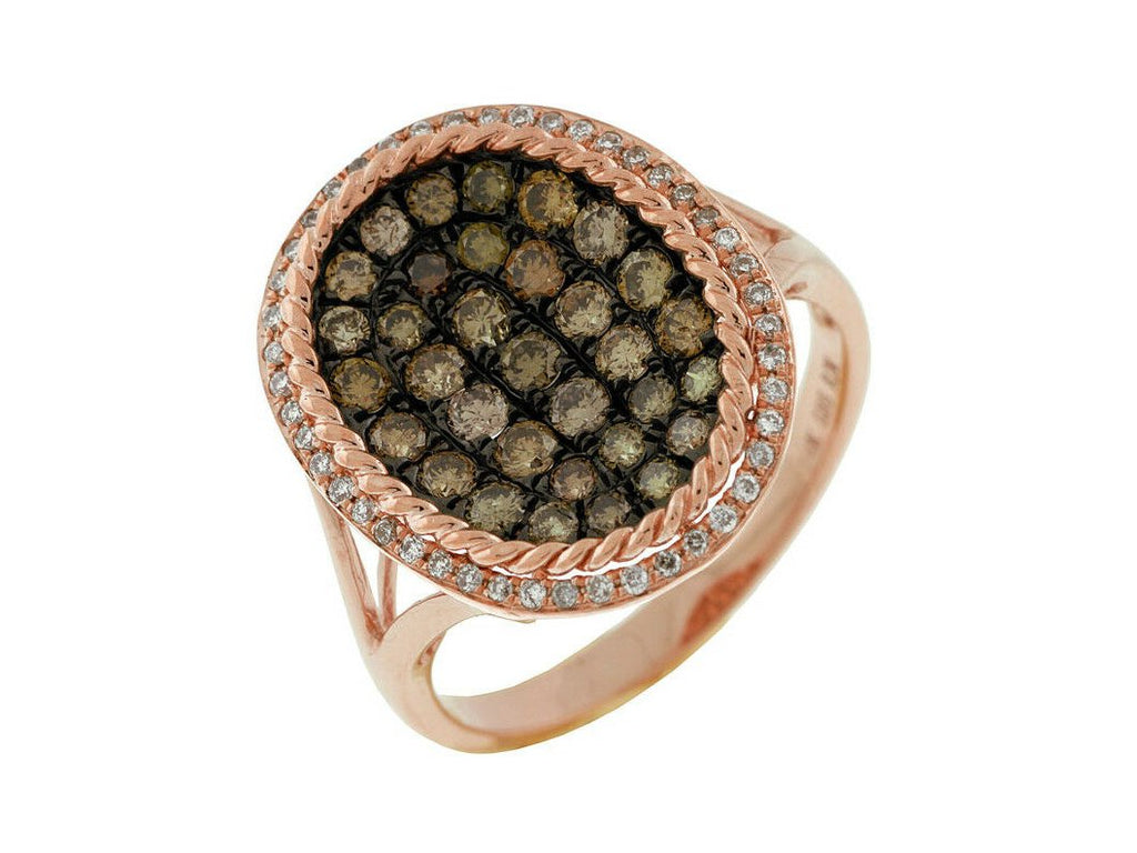 14KT ROSE GOLD FUN RING. 3D CLUSTER OVAL ROPE DESIGN. WHITE DIAMONDS ARE F/G COLOR, VSSI CLARITY .15 CARATS. CHOCOLATE FANCY DIAMONDS ARE .82 CARATS. RING SIZE 7. CAN BE SIZED BY OUR MASTER JEWELER UPON REQUEST. WRITTEN APPRAISAL AVAILABLE. COMES IN A PRESENTABLE GIFT BOX.