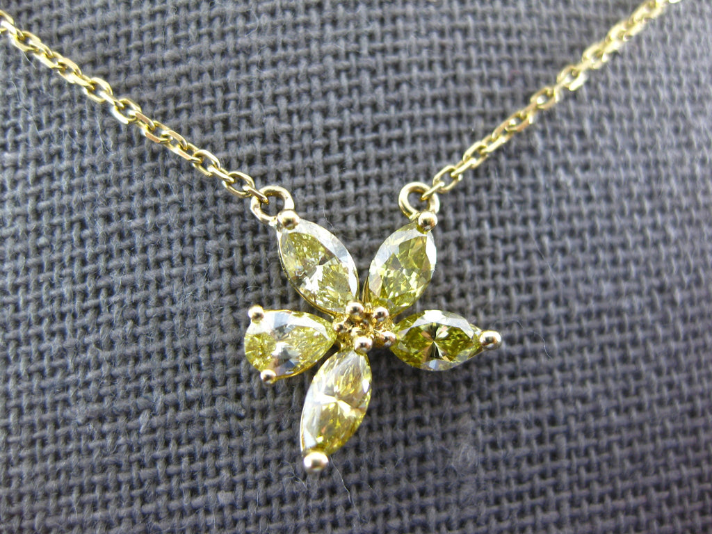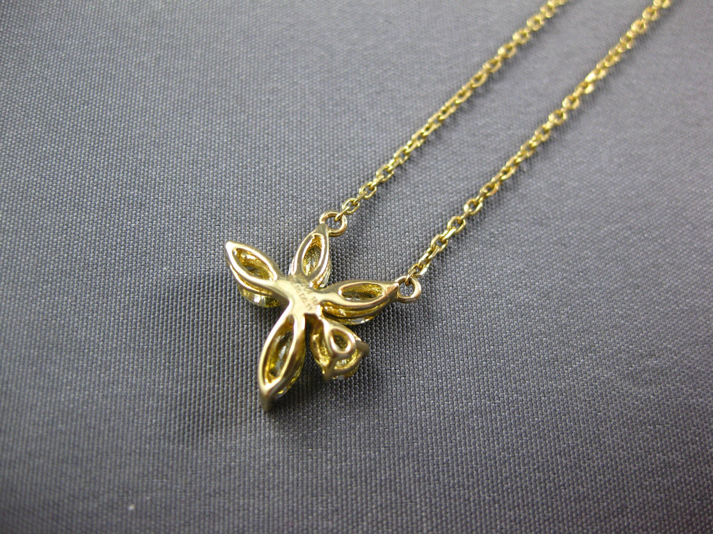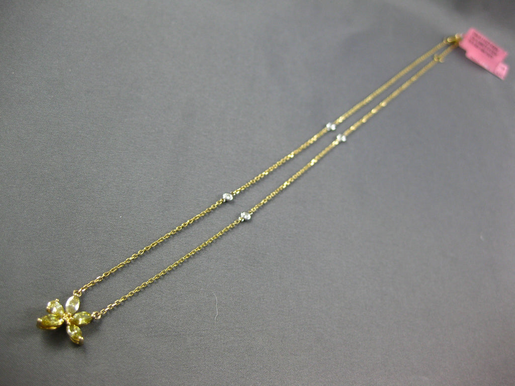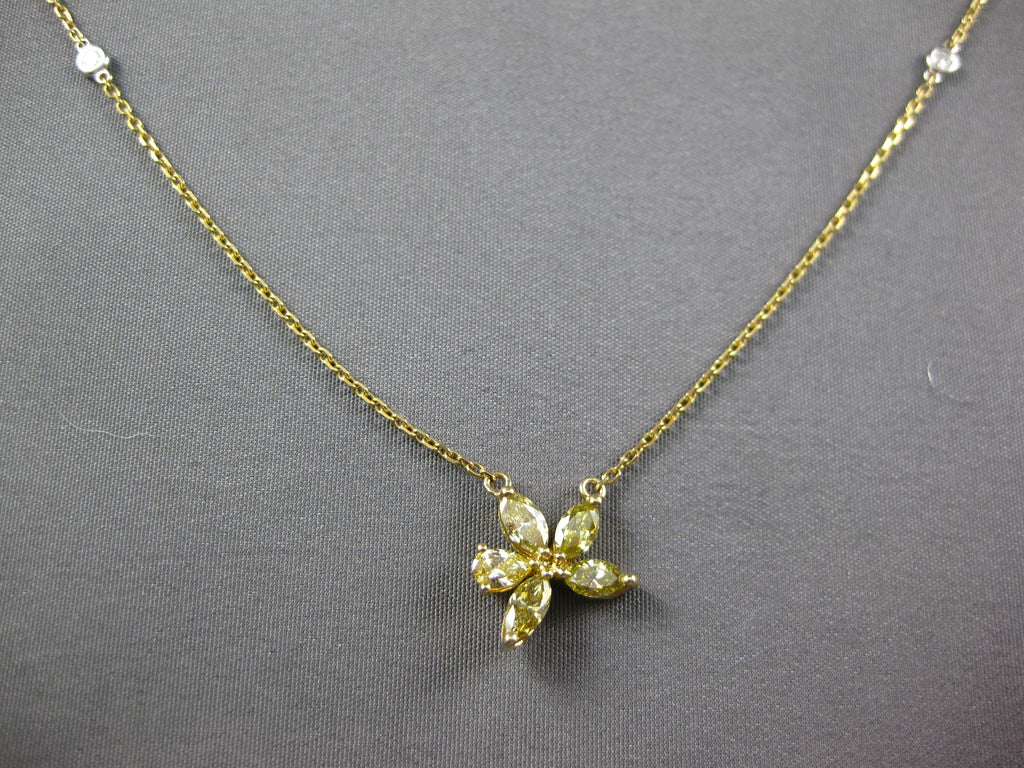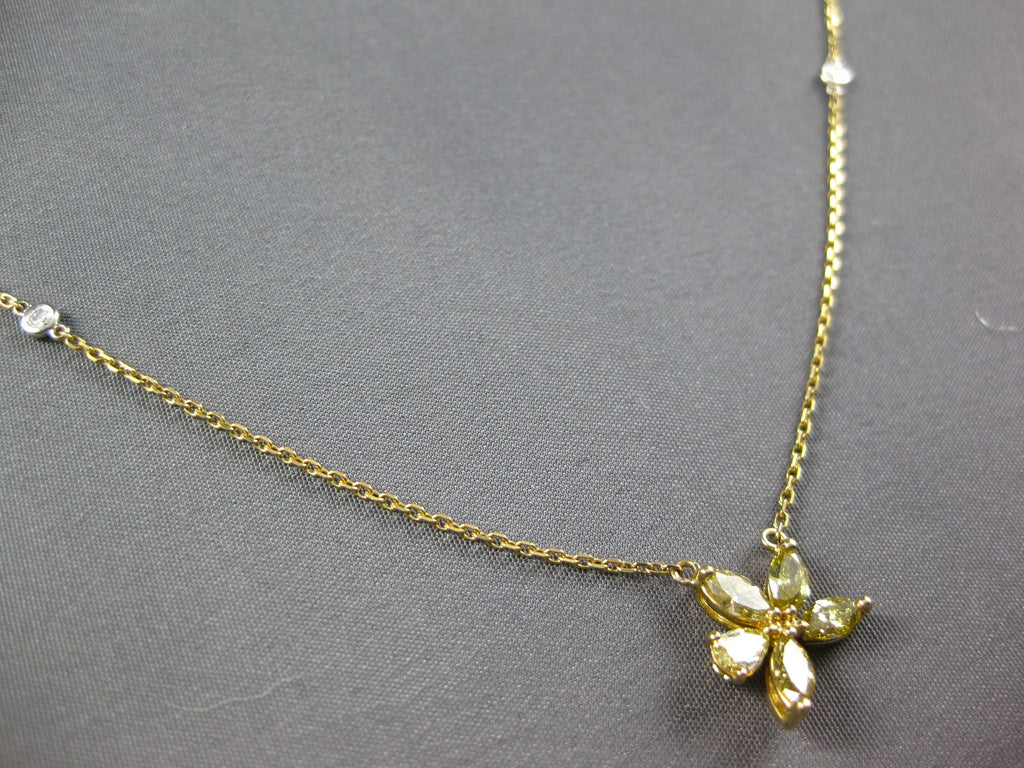 18KT YELLOW GOLD NECKLACE. 3D FLOWER BUTTERFLY BY THE YARD DESIGN. WHITE DIAMONDS ARE F/G COLOR, VS CLARITY .11 CARATS. MULTI SHAPE FANCY YELLOW DIAMONDS ARE .86 CARATS. MEASURES 14.5mm X 13mm. COMES ON A 14KT GOLD DIAMOND CUT 16" INCH CHAIN. WRITTEN APPRAISAL AVAILABLE. COMES IN A PRESENTABLE GIFT BOX.