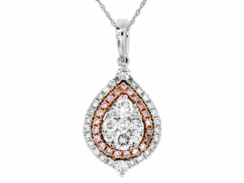 14KT WHITE AND ROSE GOLD PENDANT. 3D CLUSTER PEAR SHAPE TEAR DROP DESIGN. WHITE DIAMONDS ARE F/G COLOR, VSSI CLARITY .80 CARATS. PINK DIAMONDS ARE .17 CARATS. COMES ON A 14KT GOLD DIAMOND CUT 16" INCH CHAIN. WRITTEN APPRAISAL AVAILABLE. COMES IN A PRESENTABLE GIFT BOX.