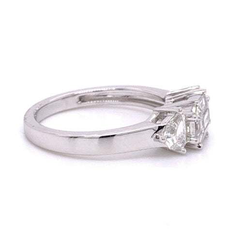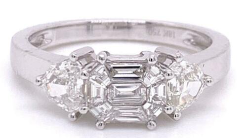 18KT WHITE GOLD ENGAGEMENT RING. 3D ILLUSION ASSCHER-LOOK THREE STONE DESIGN. MULTI SHAPE DIAMONDS ARE F/G COLOR, VSSI CLARITY .98 CARATS. RING SIZE 7. CAN BE SIZED BY OUR MASTER JEWELER UPON REQUEST. WRITTEN APPRAISAL AVAILABLE. COMES IN A PRESENTABLE GIFT BOX.