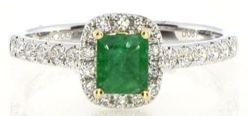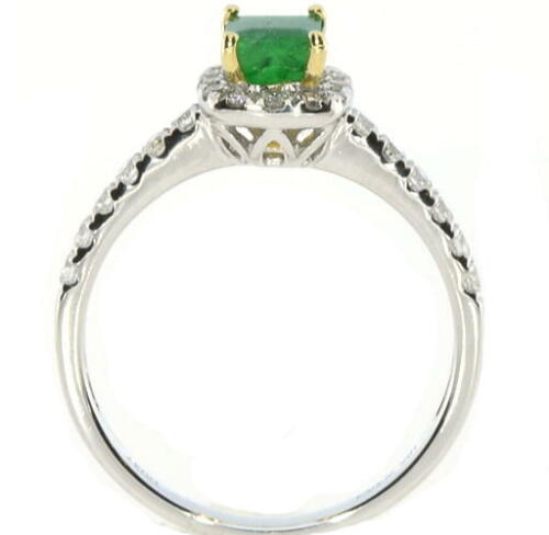 18KT WHITE AND YELLOW GOLD ENGAGEMENT RING. 3D CLASSIC HALO DESIGN. ROUND WHITE DIAMONDS ARE F/G COLOR, VSSI CLARITY .37 CARATS. AAA SQUARE EMERALD IS .61 CARATS. RING SIZE 7. CAN BE SIZED BY OUR MASTER JEWELER UPON REQUEST. WRITTEN APPRAISAL AVAILABLE. COMES IN A PRESENTABLE GIFT BOX.