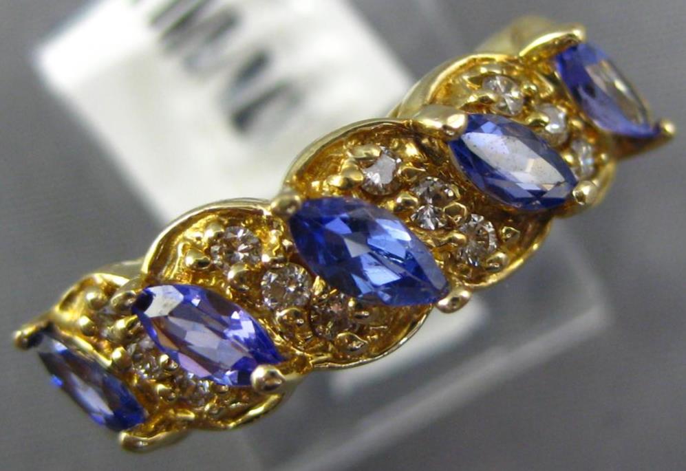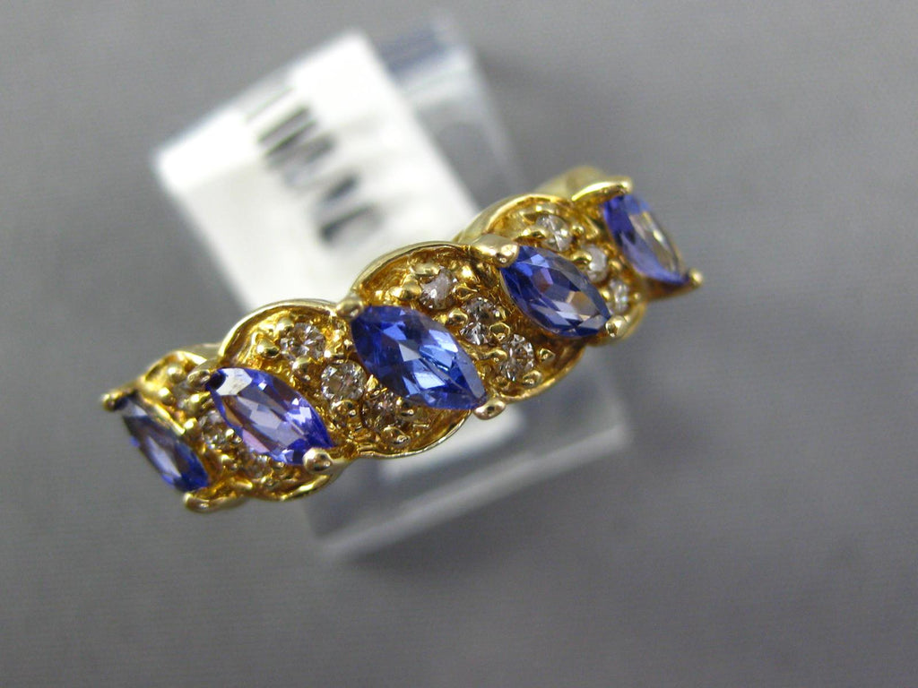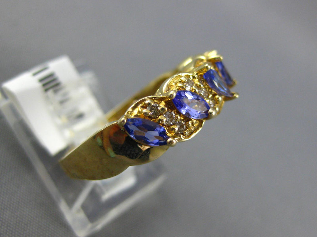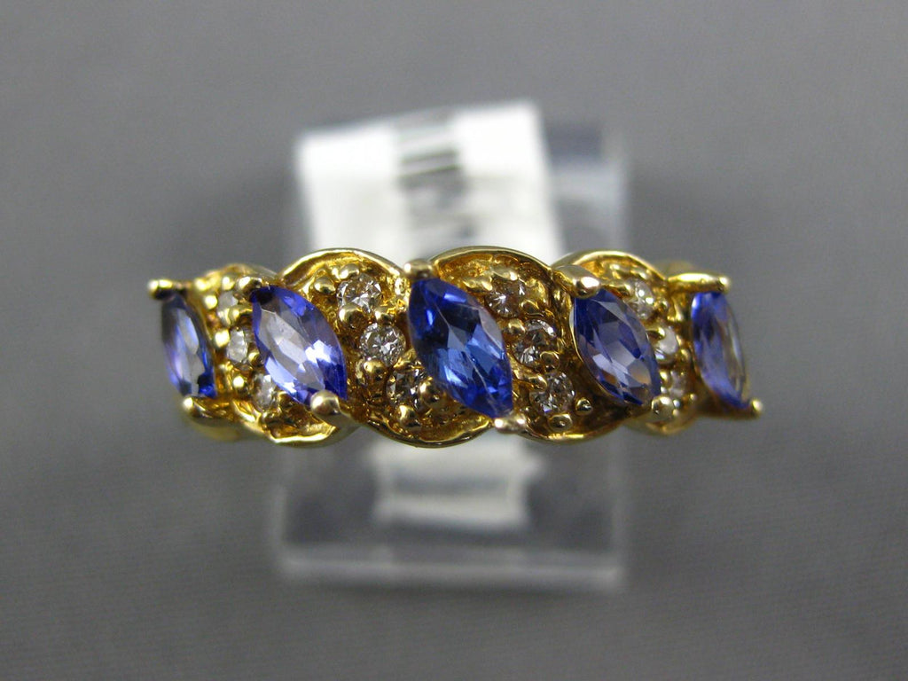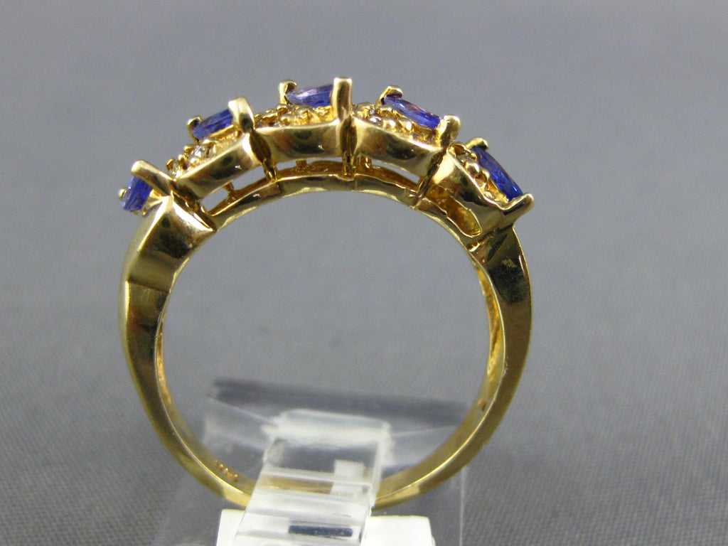 14KT YELLOW GOLD ANNIVERSARY RING. 3D MULTI WAVE DESIGN. ROUND DIAMONDS ARE F/G COLOR, VSSI CLARITY .17 CARATS. AAA MARQUISE TANZANITES ARE .82 CARATS. MEASURES 6mm WIDE. RING SIZE 6.75. CAN BE SIZED BY OUR MASTER JEWELER UPON REQUEST. WRITTEN APPRAISAL AVAILABLE. COMES IN A PRESENTABLE GIFT BOX.