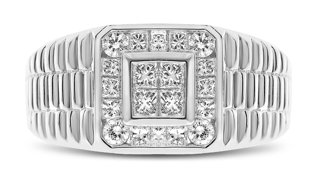 18KT WHITE GOLD MENS RING. 3D INVISIBLE SQUARE OCTAGON DESIGN. ROUND AND PRINCESS DIAMONDS ARE F/G COLOR, VSSI CLARITY .89 CARATS. MEASURES 11mm WIDE. RING SIZE 10. CAN BE SIZED BY OUR MASTER JEWELER UPON REQUEST. WRITTEN APPRAISAL AVAILABLE. COMES IN A PRESENTABLE GIFT BOX.