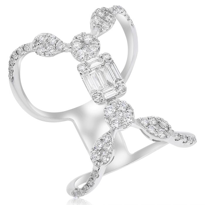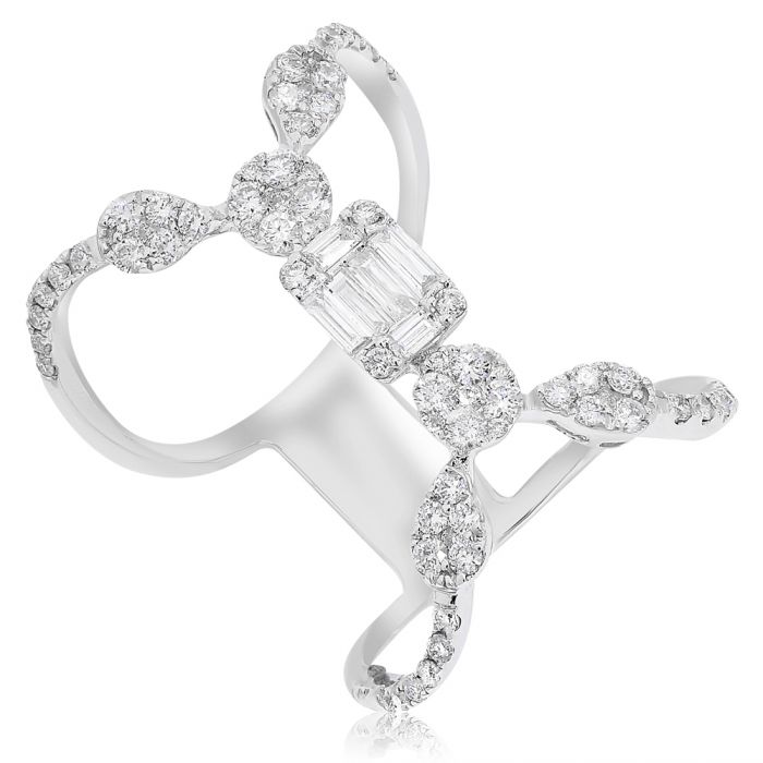 .89CT DIAMOND 18KT WHITE GOLD ROUND AND BAGUETTE MULTI FLOWER CLUSTER FUN RING
