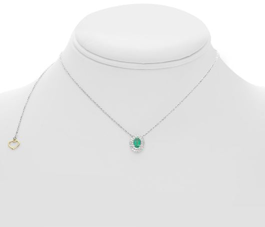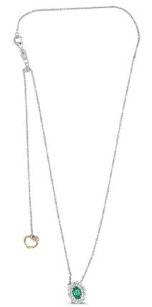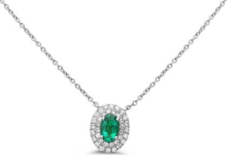 18KT WHITE GOLD LOVE NECKLACE. 3D DOUBLE HALO DESIGN. ROUND DIAMONDS ARE F/G COLOR, VSSI CLARITY .23 CARATS. OVAL AAA EMERALD IS .46 CARATS. MEASURES 11mm X 9mm. 16" INCHES LONG. WRITTEN APPRAISAL AVAILABLE. COMES IN A PRESENTABLE GIFT BOX.