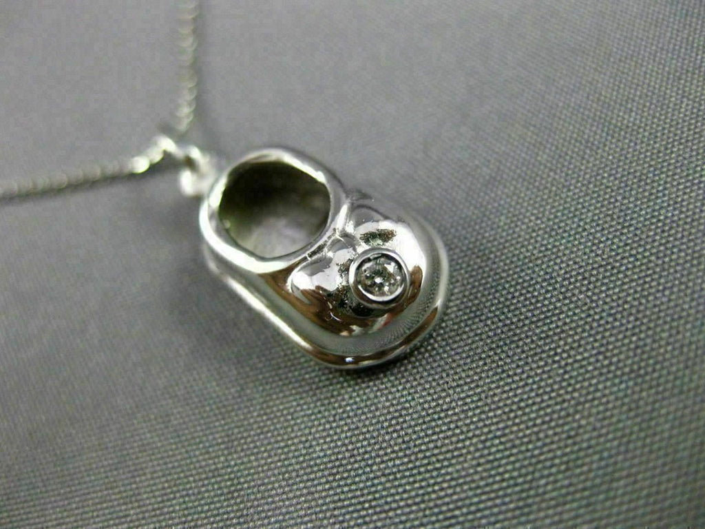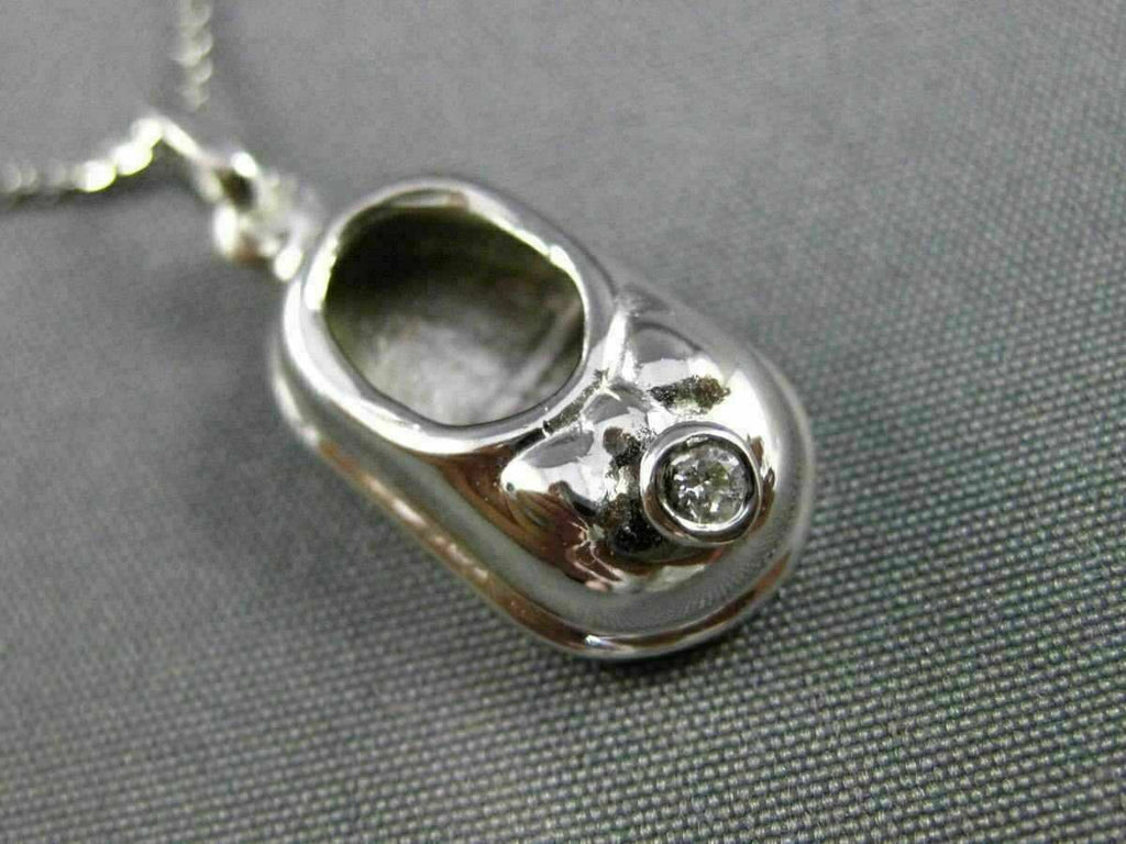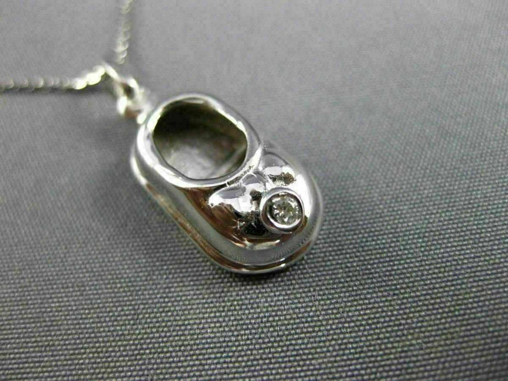 ESTATE 14KT WHITE GOLD FLOATING PENDANT. 3D HANDCRAFTED BOW BABY GIRL SHOE DESIGN. DIAMONDS ARE G COLOR, VS CLARITY .03 CARATS. MEASURES 25mm X 9mm. COMES ON A 14KT GOLD DIAMOND CUT 16" INCH CHAIN. WRITTEN APPRAISAL AVAILABLE. COMES IN A PRESENTABLE GIFT BOX.
