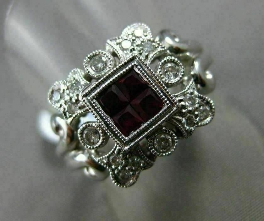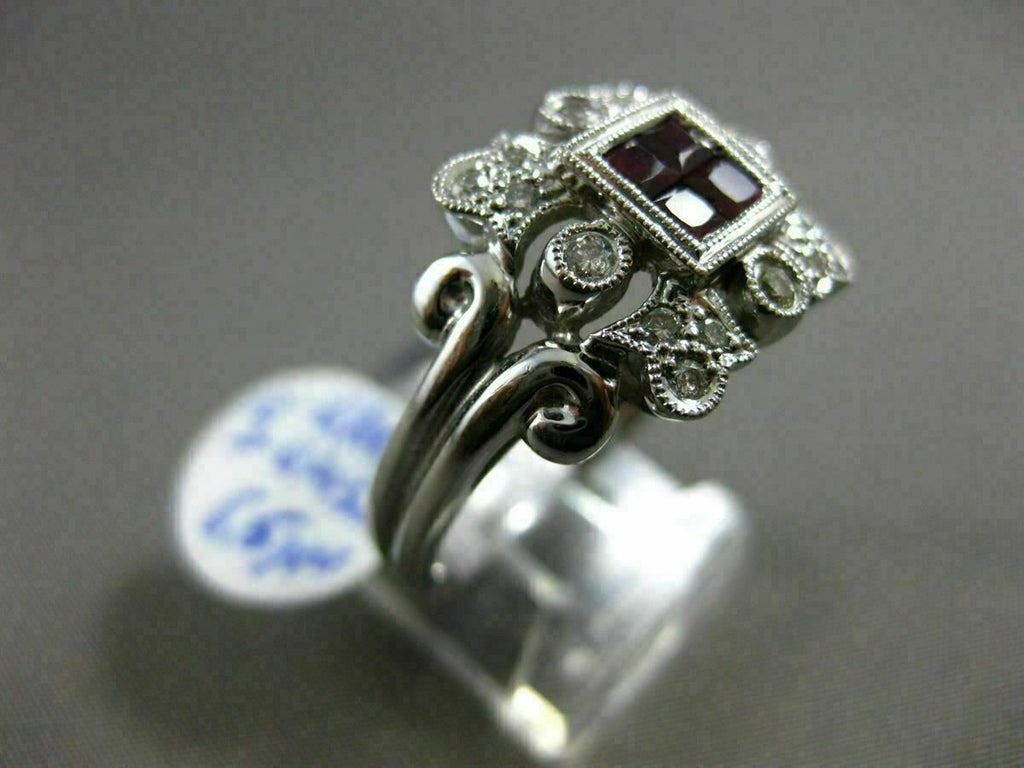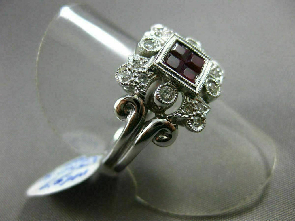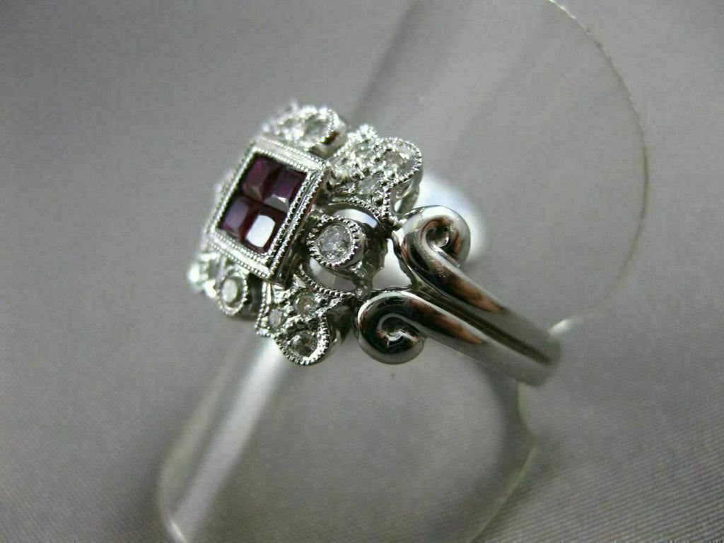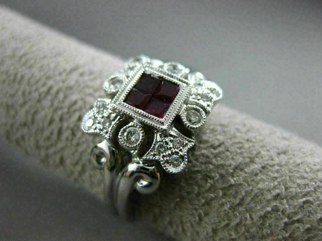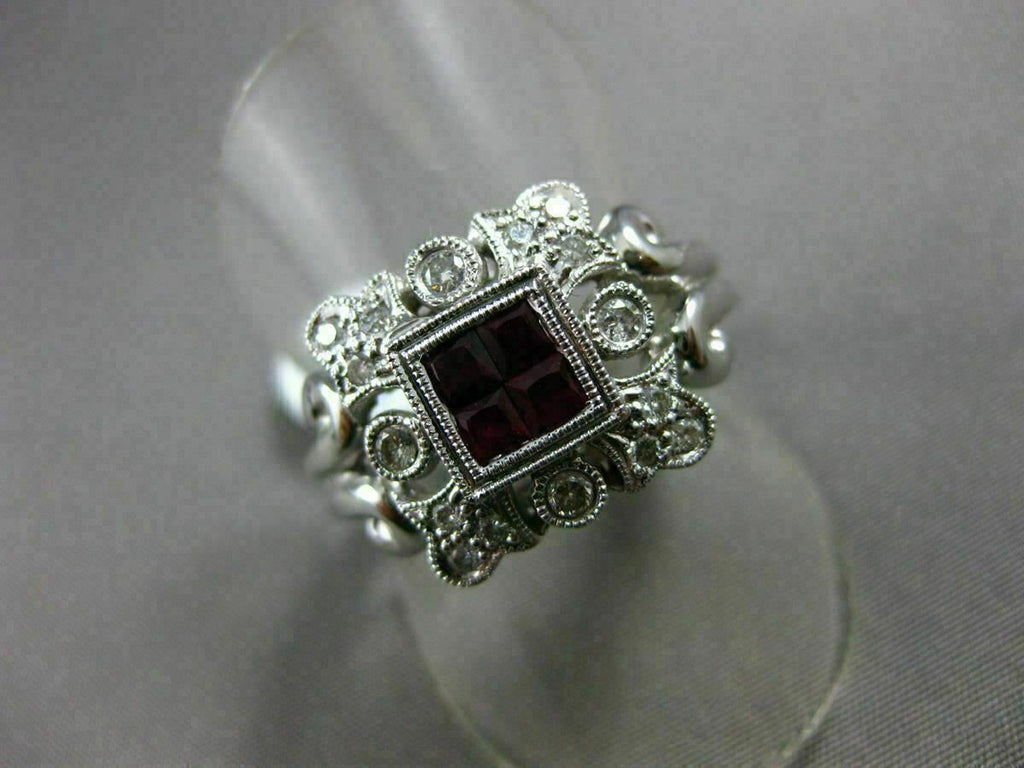 ESTATE 18KT WHITE GOLD RING. 3D SQUARE FILIGREE FLORAL DESIGN. ROUND DIAMONDS ARE F/G COLOR, VSSI CLARITY .45 CARATS. AAA RUBIES ARE .60 CARATS. MEASURES 12.5mm WIDE. RING SIZE 8.25. CAN BE SIZED BY OUR MASTER JEWELER UPON REQUEST. WRITTEN APPRAISAL AVAILABLE. COMES IN A PRESENTABLE GIFT BOX.