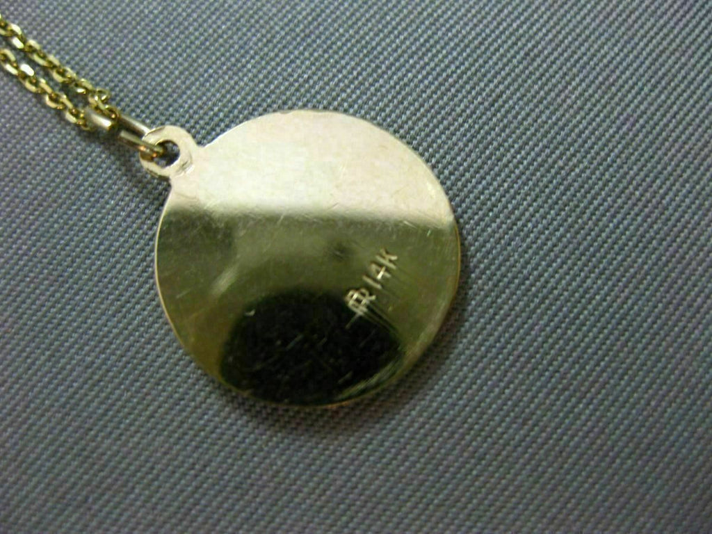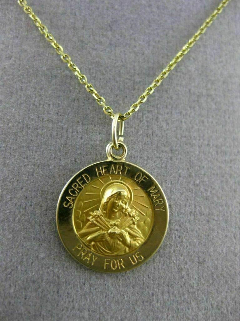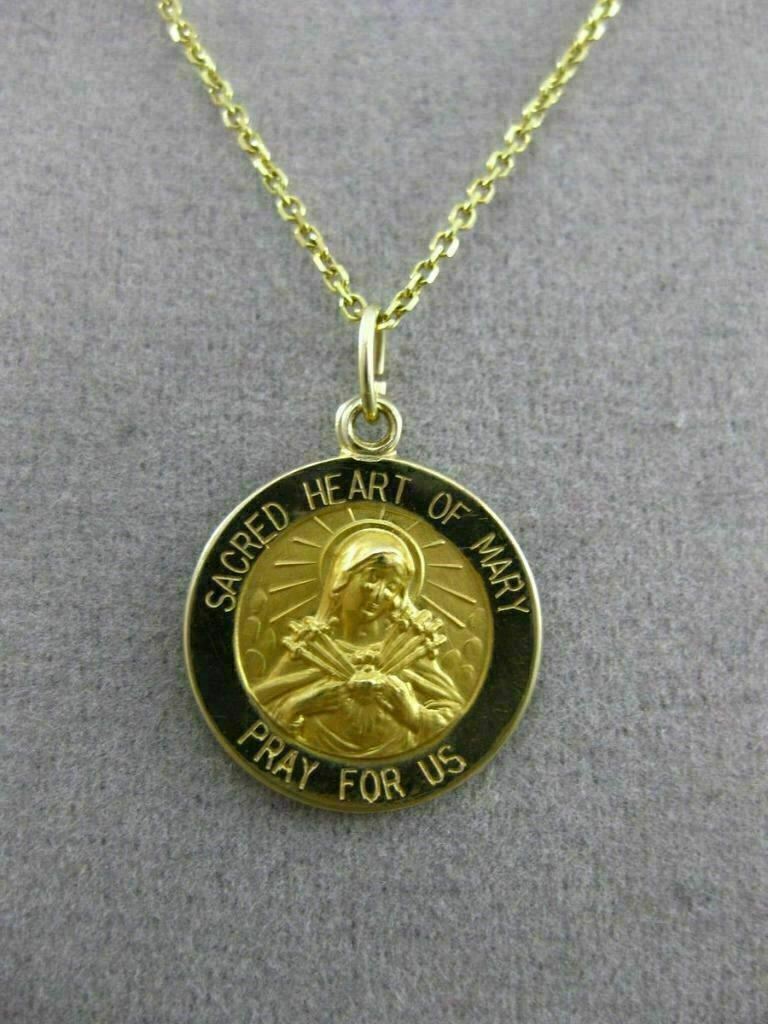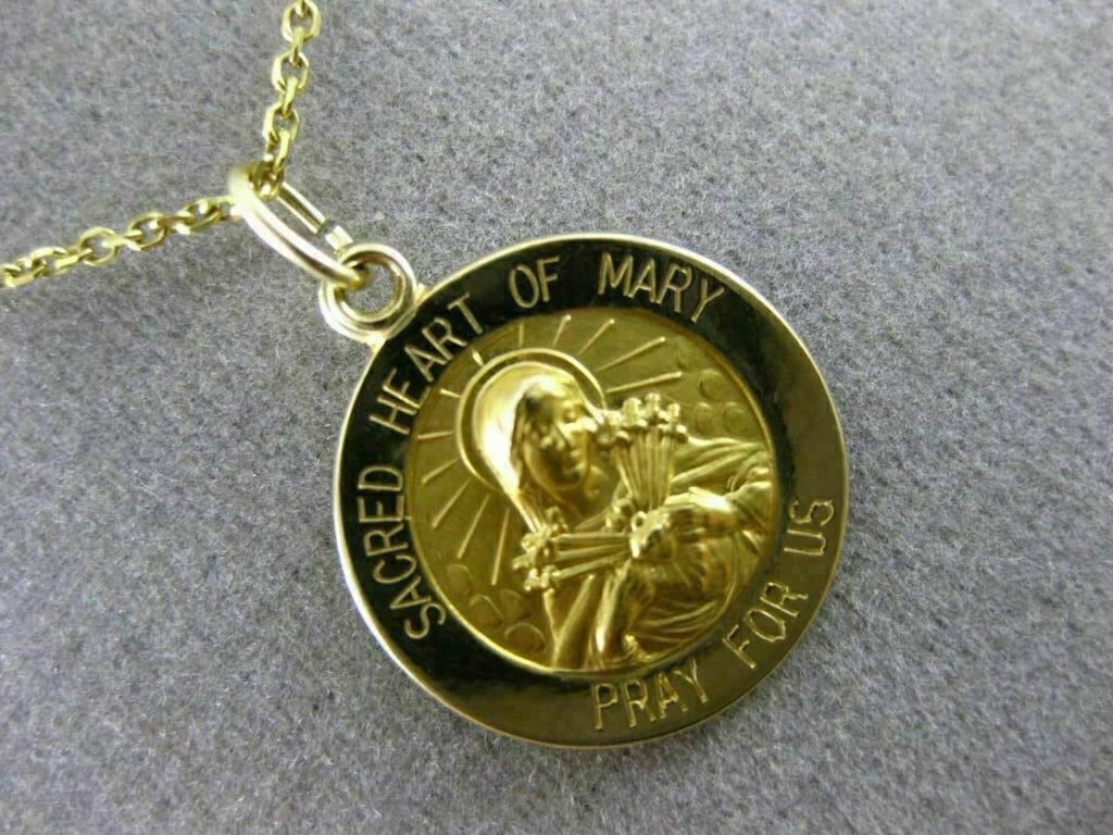 ESTATE 14KT YELLOW GOLD FLOATING PENDANT. 3D CIRCULAR HANDCRAFTED SACRED HEART OF MARY PRAY FOR US DESIGN. MEASURES 20mm X 15mm WIDE. COMES ON A 14KT GOLD DIAMOND CUT 16" INCH CHAIN. WRITTEN APPRAISAL AVAILABLE. COMES IN A PRESENTABLE GIFT BOX.
