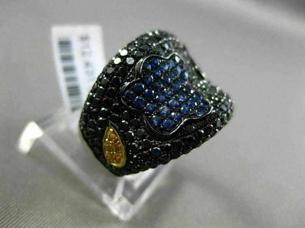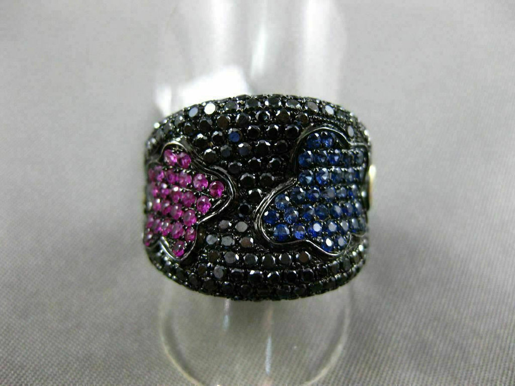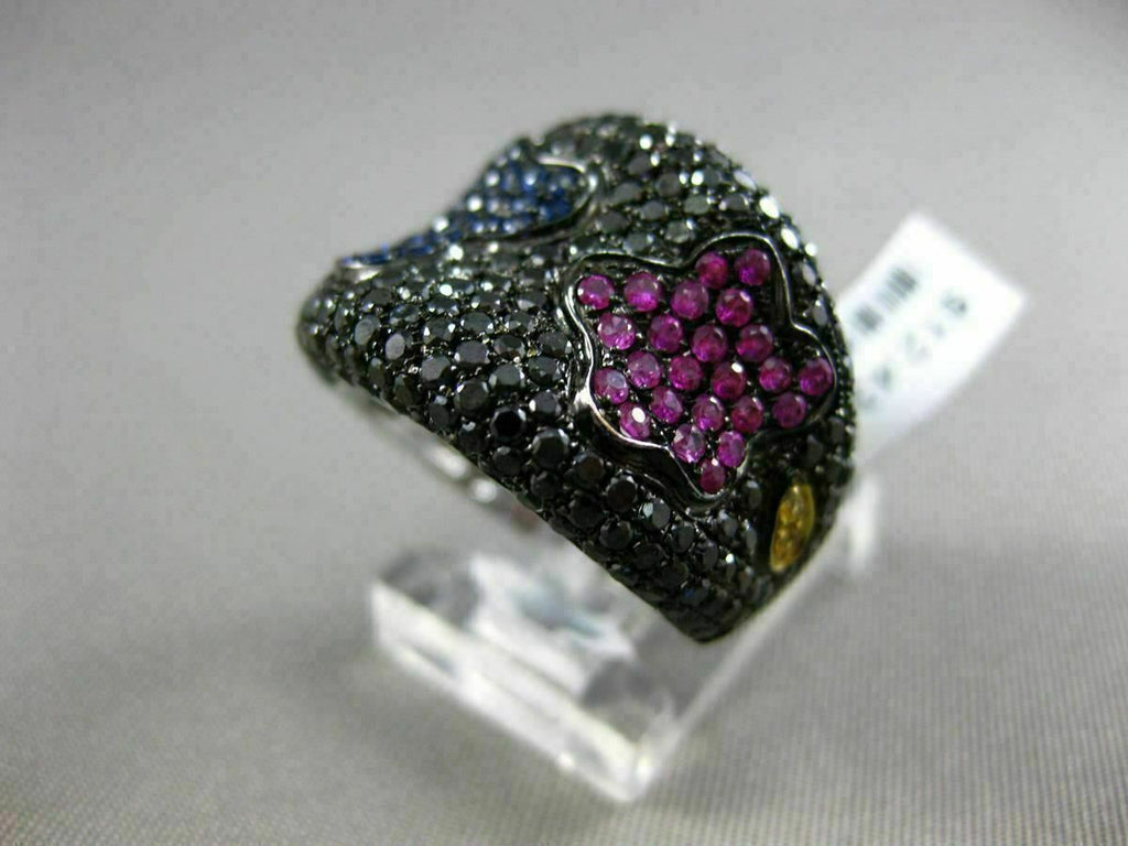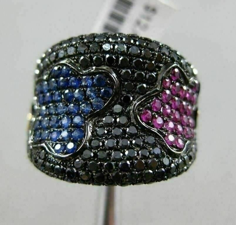 ESTATE 18KT WHITE & BLACK GOLD LOVE RING. 3D BUTTERFLY DESIGN. BLACK DIAMONDS ARE 2.03 CARATS. AAA MULTI COLOR SAPPHIRES ARE .82 CARATS. MEASURES 16.5mm WIDE. RING SIZE 6.50. CAN BE SIZED BY OUR MASTER JEWELER UPON REQUEST. WRITTEN APPRAISAL AVAILABLE. COMES IN A PRESENTABLE GIFT BOX.