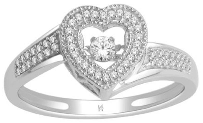 ESTATE 14KT WHITE GOLD LOVE RING. 3D HEART DIAMONDS SOLITAIRE FLOATING DESIGN. ROUND ARE F/G COLOR, VSSI CLARITY 0.2 CARATS. RING SIZE 6.75. CAN BE SIZED BY OUR MASTER JEWELER UPON REQUEST. WRITTEN APPRAISAL AVAILABLE. COMES IN A PRESENTABLE GIFT BOX.