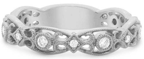 ESTATE 14KT WHITE GOLD WEDDING ANNIVERSARY RING. 3D ORNATE MILGRAIN 3/4 ETERNITY DESIGN. DIAMONDS ARE F/G COLOR, VSSI CLARITY .20 CARATS. MEASURES 4mm WIDE. RING SIZE 6.50. CAN BE SIZED BY OUR MASTER JEWELER UPON REQUEST. WRITTEN APPRAISAL AVAILABLE. COMES IN A PRESENTABLE GIFT BOX.