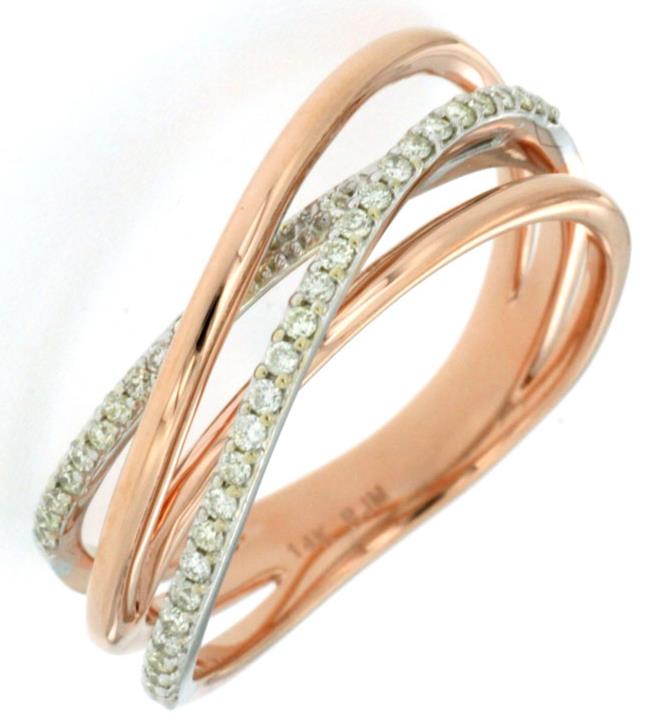 ESTATE 14KT WHITE AND ROSE GOLD LOVE RING. 3D MULTI ROW CRISS CROSS DESIGN. DIAMONDS ARE F/G COLOR, VSSI CLARITY .20 CARATS. RING SIZE 7. CAN BE SIZED BY OUR MASTER JEWELER UPON REQUEST. WRITTEN APPRAISAL AVAILABLE. COMES IN A PRESENTABLE GIFT BOX.