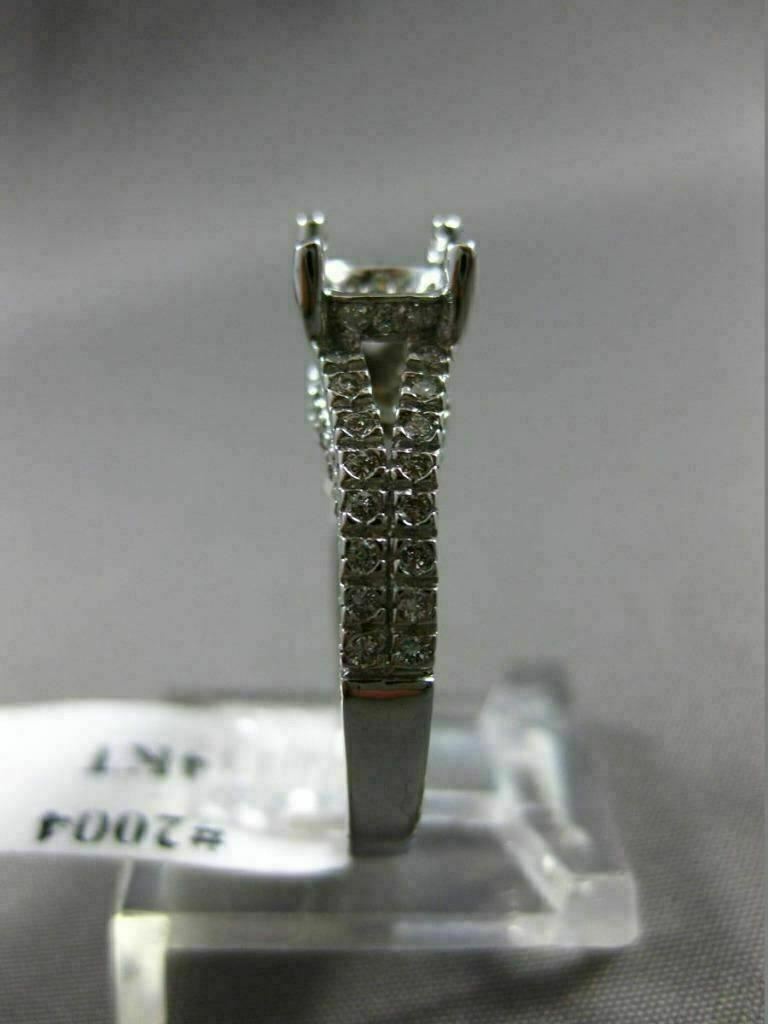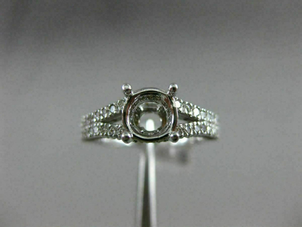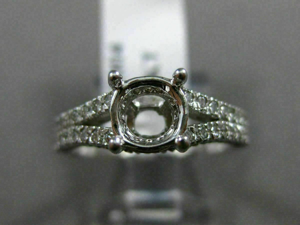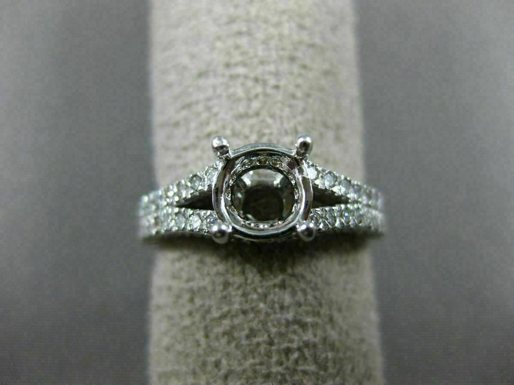 ESTATE 14KT WHITE GOLD SEMI MOUNT ENGAGEMENT RING. 3D SPLIT BAND ROUND DESIGN. DIAMONDS ARE F/G COLOR, VVS/VS CLARITY .68 CARATS. FITS UP TO 5mm STONE. MEASURES 6mm WIDE. RING SIZE 7. CAN BE SIZED BY OUR MASTER JEWELER UPON REQUEST. WRITTEN APPRAISAL AVAILABLE. COMES IN A PRESENTABLE GIFT BOX.