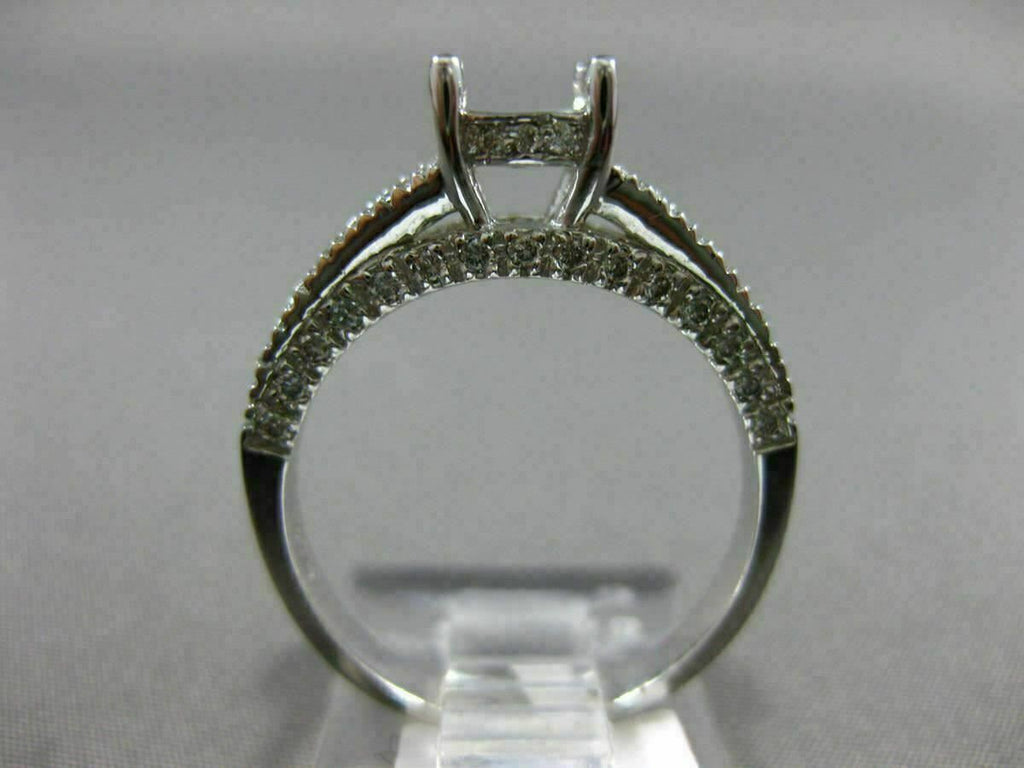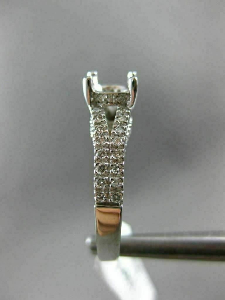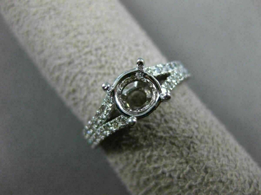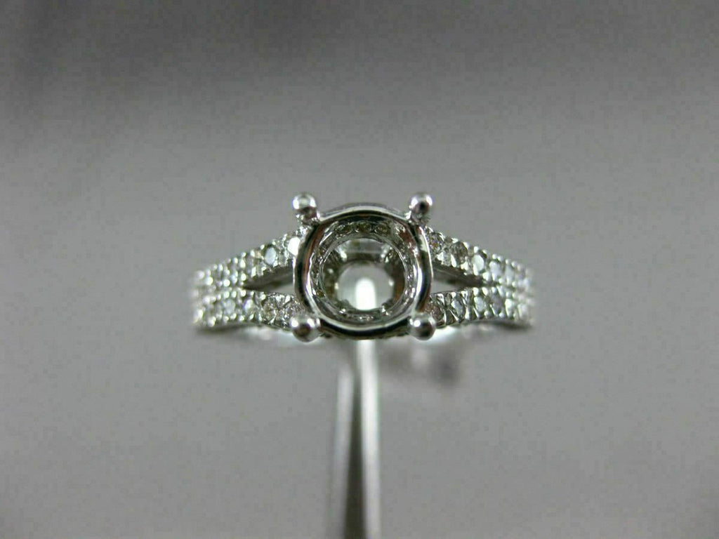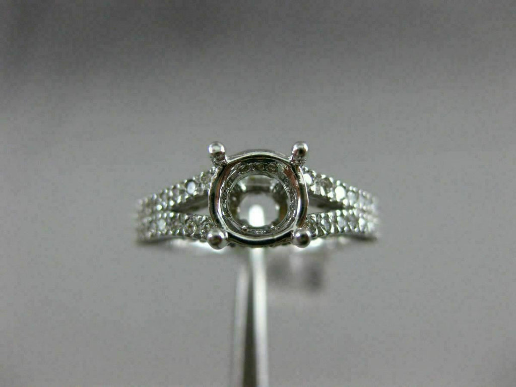 ESTATE 14KT WHITE GOLD SEMI MOUNT ENGAGEMENT RING. 3D SPLIT BAND ROUND DESIGN. DIAMONDS ARE F/G COLOR, VVS/VS CLARITY .68 CARATS. FITS UP TO 5mm STONE. MEASURES 6mm WIDE. RING SIZE 7. CAN BE SIZED BY OUR MASTER JEWELER UPON REQUEST. WRITTEN APPRAISAL AVAILABLE. COMES IN A PRESENTABLE GIFT BOX.