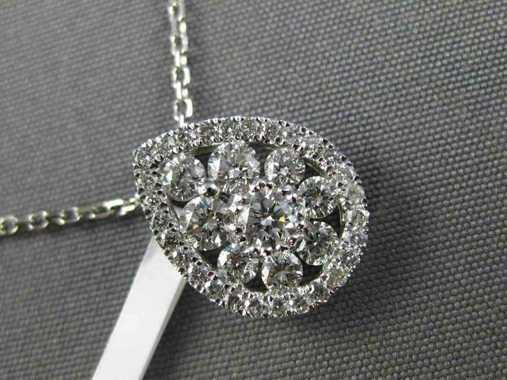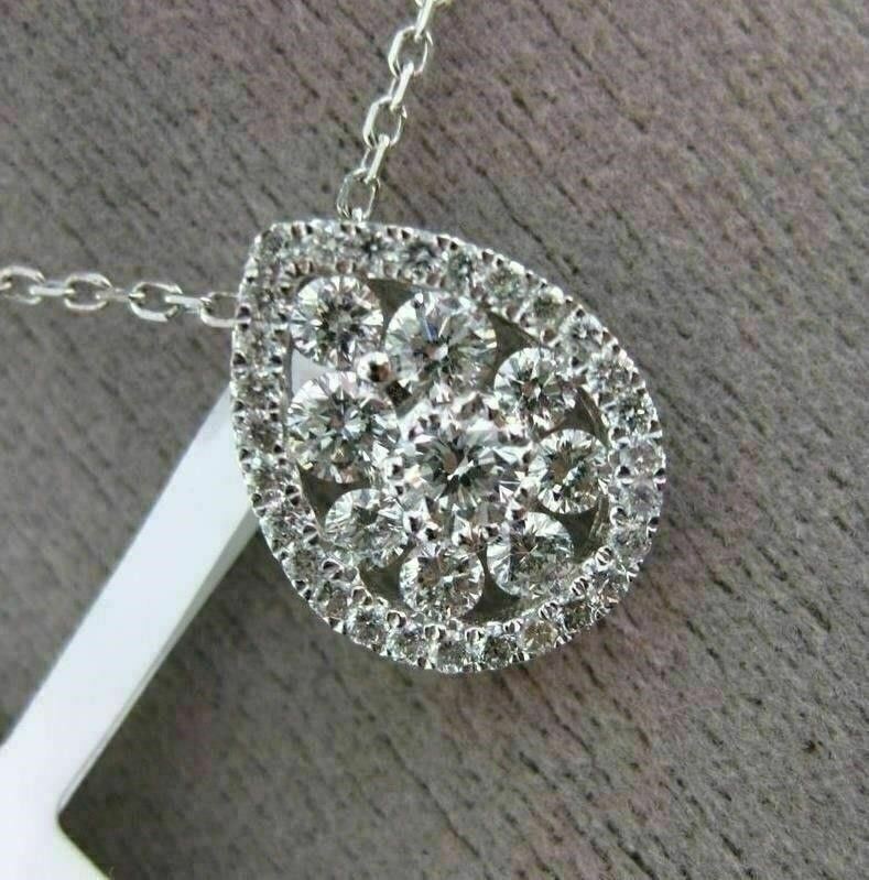 ESTATE 18KT WHITE GOLD PENDANT. CLASSIC CLUSTER PEAR SHAPE HALO DESIGN. DIAMONDS ARE F/G COLOR, VVS/VS CLARITY .73 CARATS. MEASURES 12mm X 10mm WIDE. COMES ON A 14KT GOLD DIAMOND CUT 16" INCH CHAIN. WRITTEN APPRAISAL AVAILABLE. COMES IN A PRESENTABLE GIFT BOX.