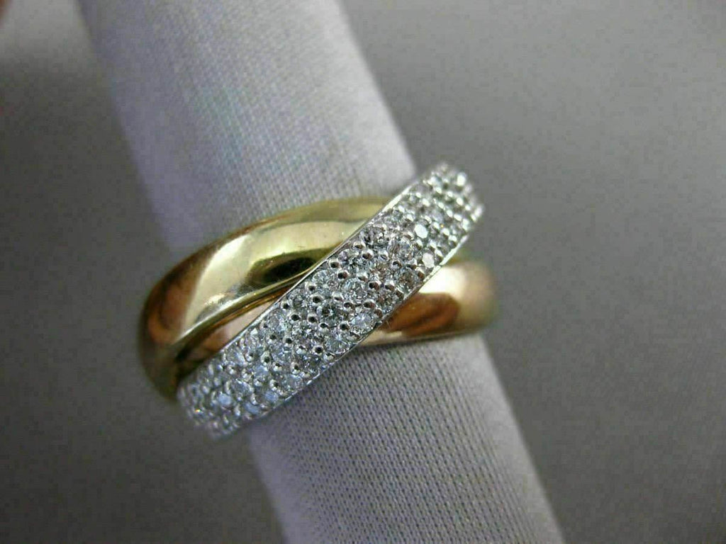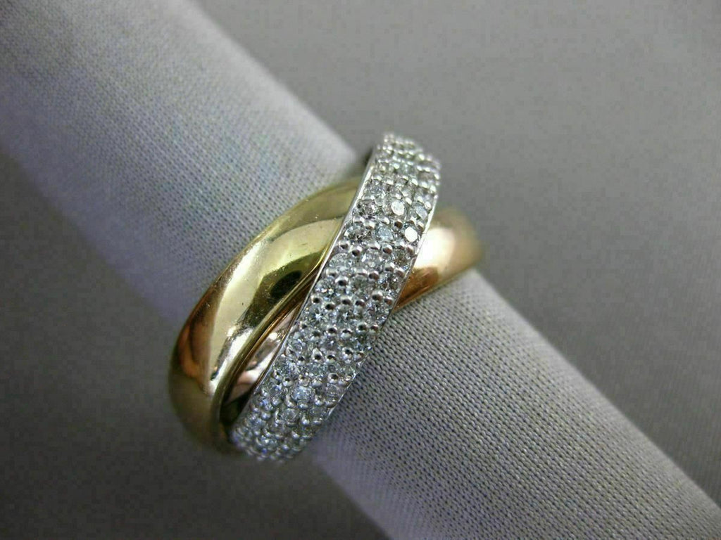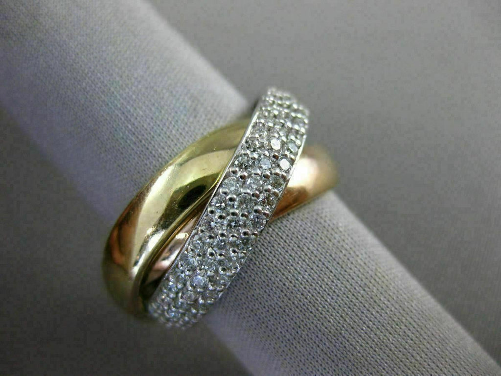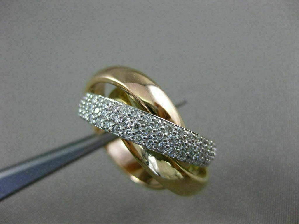 ESTATE LARGE 14KT WHITE, YELLOW & ROSE GOLD LOVE RING. 3D TRINITY DESIGN. DIAMONDS ARE F/G COLOR, VSSI CLARITY 1.32 CARATS. EACH RING MEASURES 4mm WIDE. RING SIZE 6.75. CAN BE SIZED BY OUR MASTER JEWELER UPON REQUEST. WRITTEN APPRAISAL AVAILABLE. COMES IN A PRESENTABLE GIFT BOX.