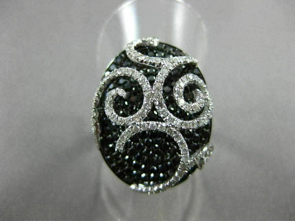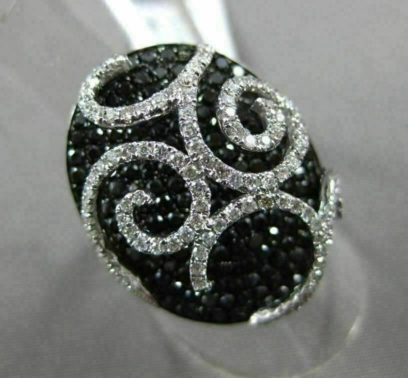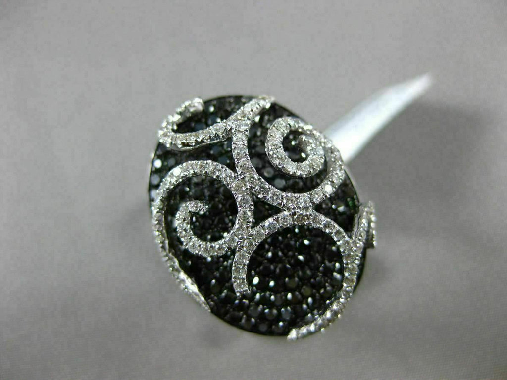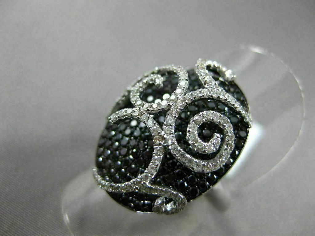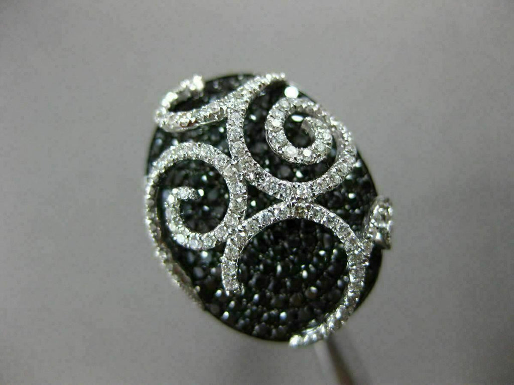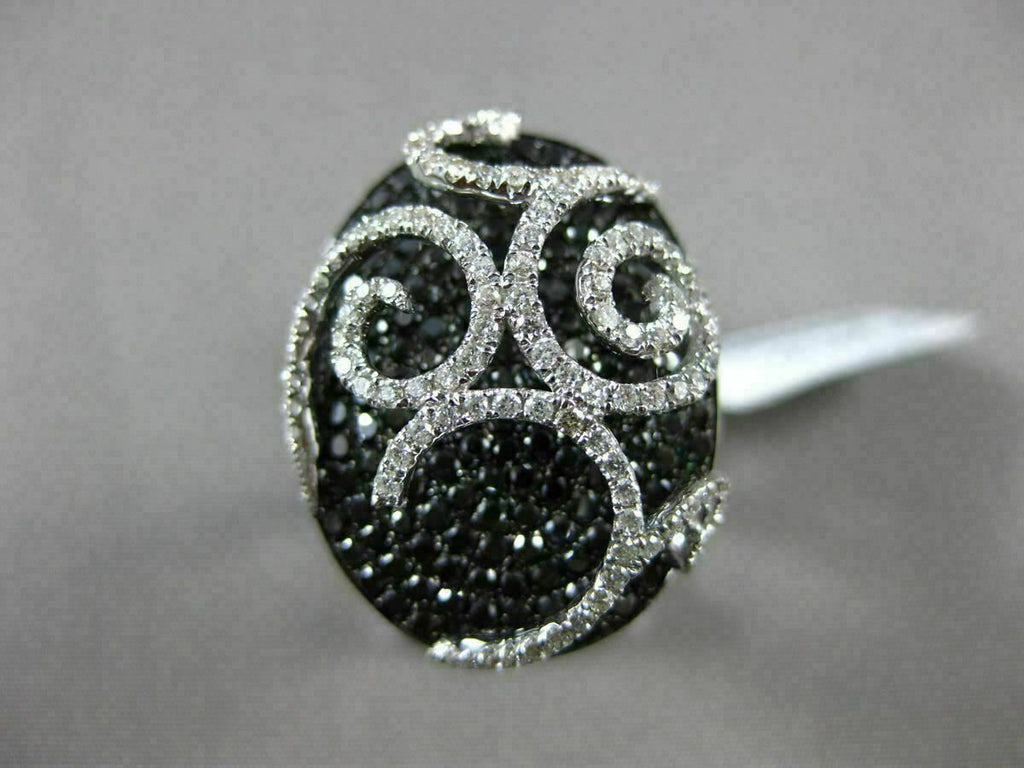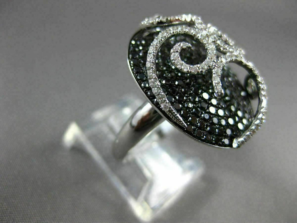 ESTATE LARGE 18KT WHITE GOLD FUN RING. 3D FILIGREE OVAL DESIGN. WHITE & BLACK DIAMONDS ARE F/G COLOR, VVS/VS CLARITY 1.89 CARATS. MEASURES 22MM WIDE. RING SIZE 6.50. CAN BE SIZE BY OUR MASTER JEWELERS UPON REQUEST. WRITTEN APPRAISAL AVAILABLE. COMES IN A PRESENTABLE GIFT BOX.