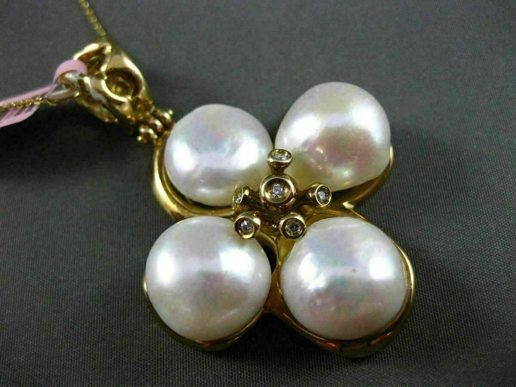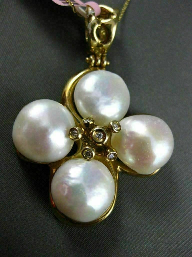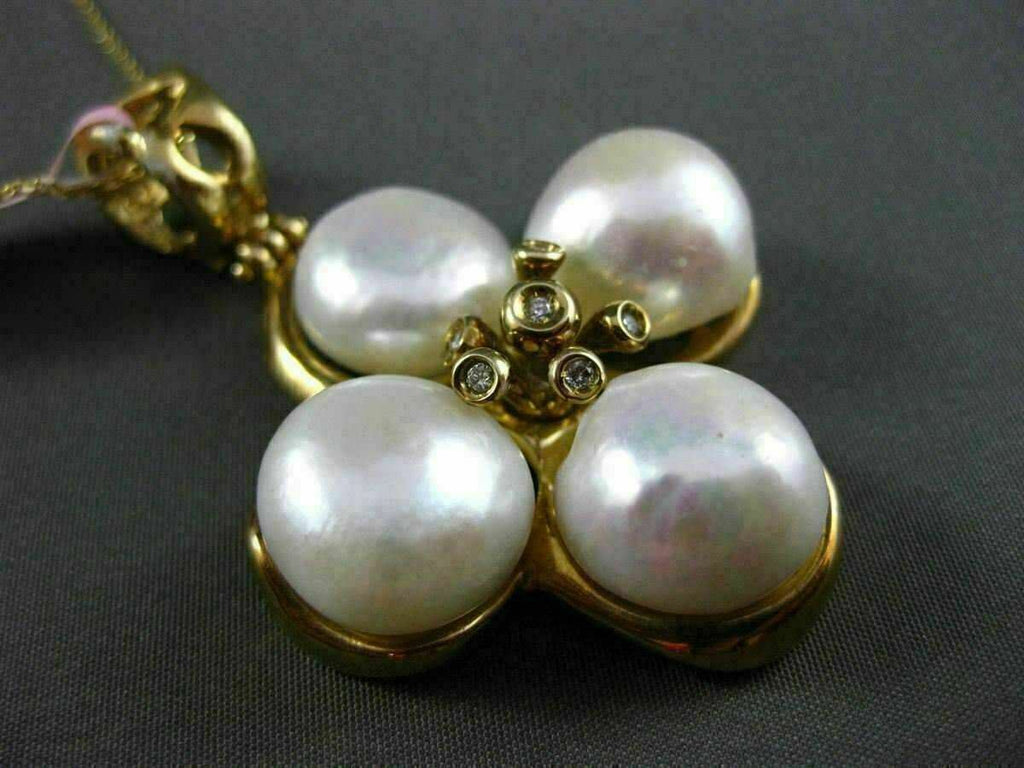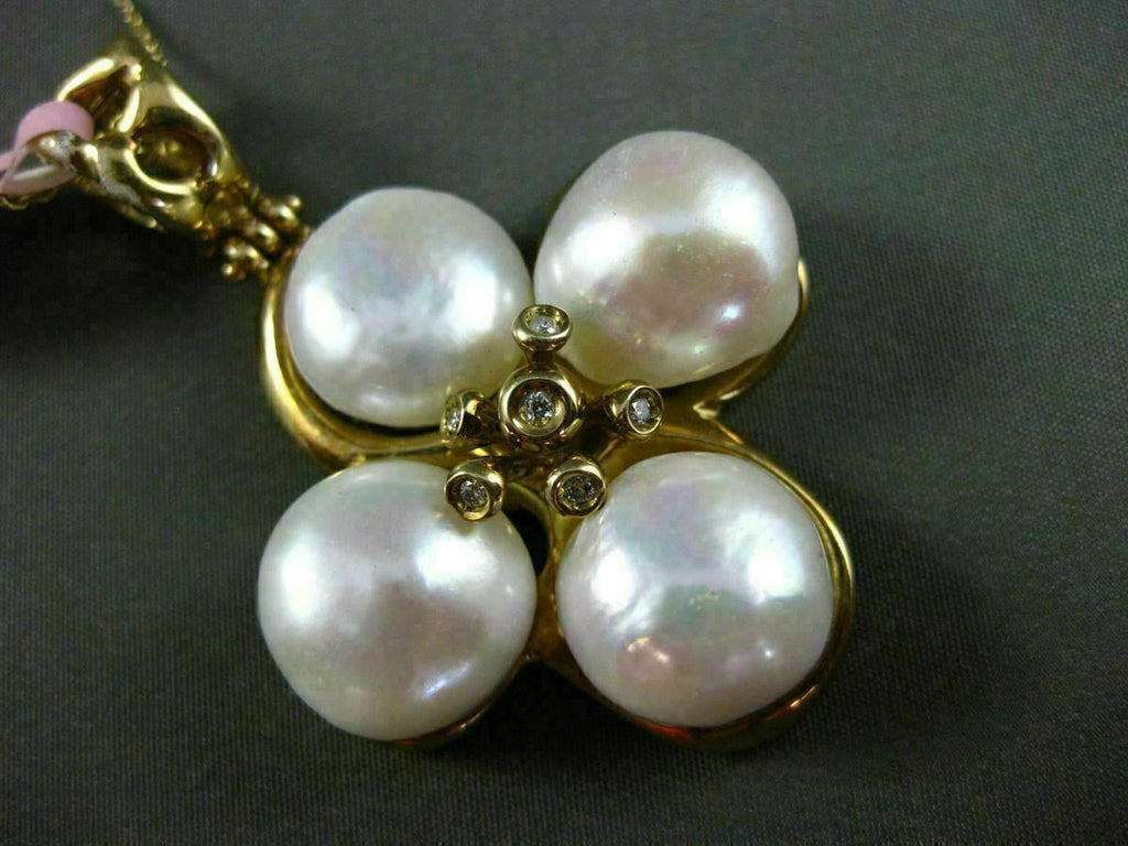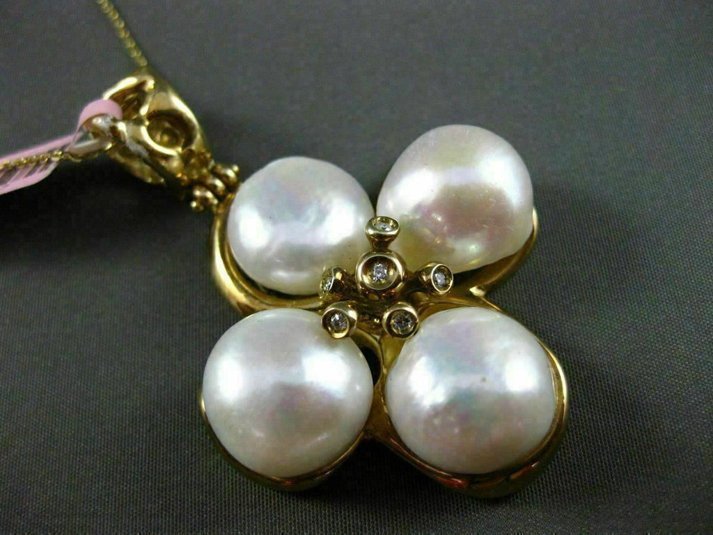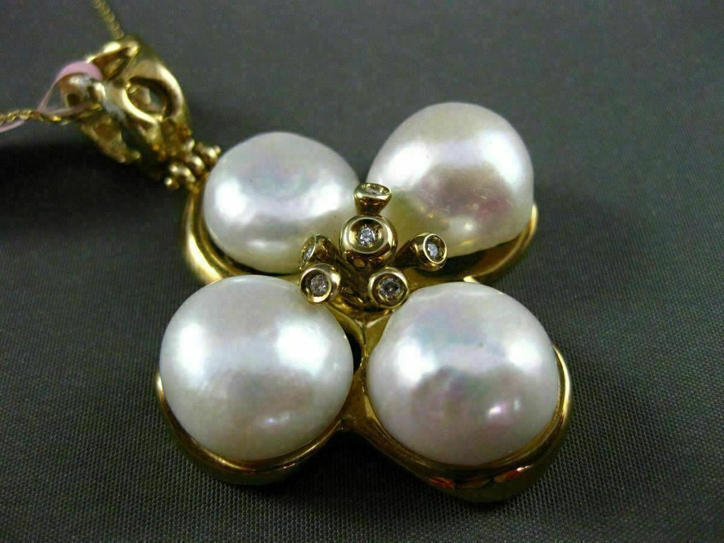 ESTATE EXTRA LARGE 14KT YELLOW GOLD HANGING PENDANT. HANDCRAFTED FLOWER DESIGN. DIAMONDS ARE F/G COLOR, VS CLARITY .12 CARATS. FEATURES AAA SOUTH SEA PEARLS. MEASURES 54mm X 37mm WIDE. COMES ON A 14KT GOLD DIAMOND CUT 16" INCH CHAIN. WRITTEN APPRAISAL AVAILABLE. COMES IN A PRESENTABLE GIFT BOX.
