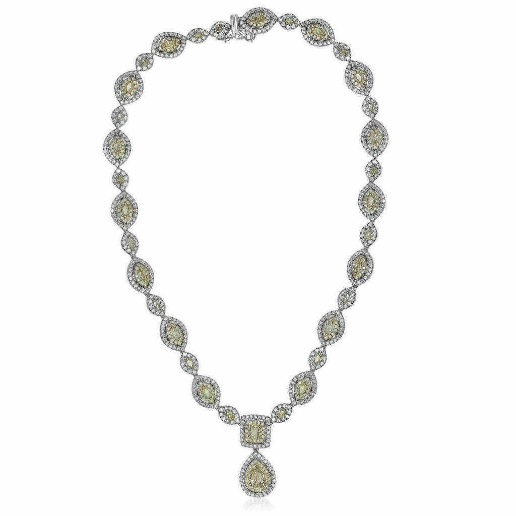 ESTATE LARGE 18KT WHITE AND YELLOW GOLD TENNIS NECKLACE. 3D TEAR DROP MULTI SHAPE DESIGN. WHITE DIAMONDS ARE F/G COLOR, VSSI CLARITY 7.89 CARATS. YELLOW DIAMONDS ARE 9.55 CARATS. MEASURES 33mm X 15mm. 17" INCHES LONG. WRITTEN APPRAISAL AVAILABLE. COMES IN A PRESENTABLE GIFT BOX.