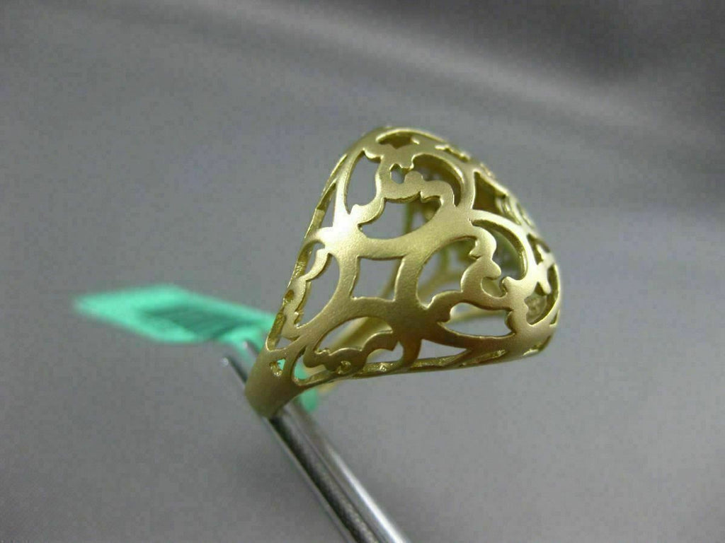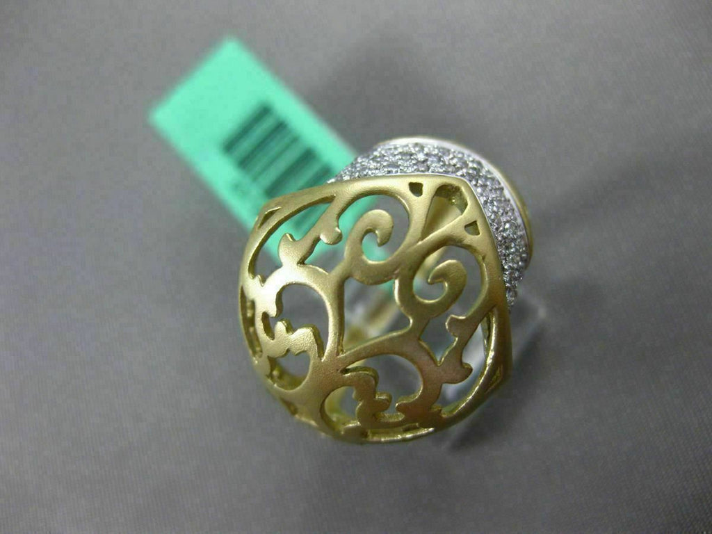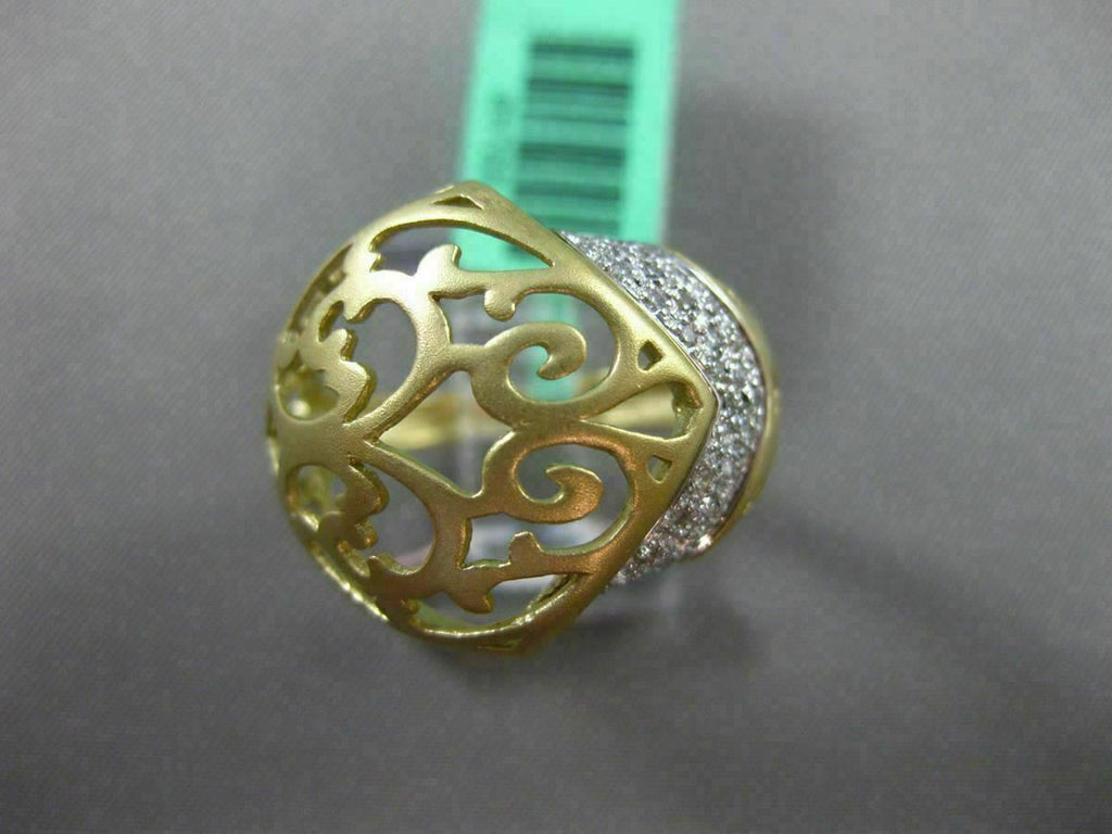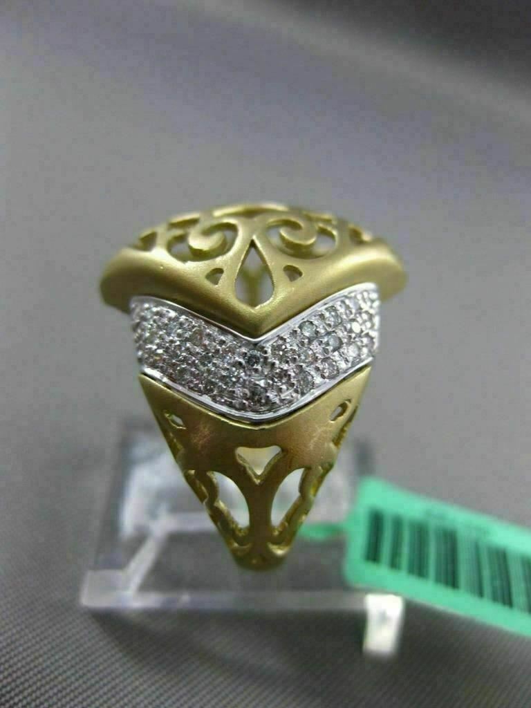 ESTATE LARGE 18KT WHITE & YELLOW GOLD FUN RING. 3D HANDCRAFTED OPEN FILIGREE MATTE DESIGN. DIAMONDS ARE F/G COLOR, VSSI CLARITY .29 CARATS. MEASURES 18.5mm WIDE. RING SIZE IS 7. CAN BE SIZED BY OUR MASTER JEWELER. WRITTEN APPRAISAL AVAILABLE. COMES IN A PRESENTABLE GIFT BOX.