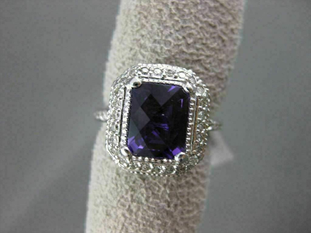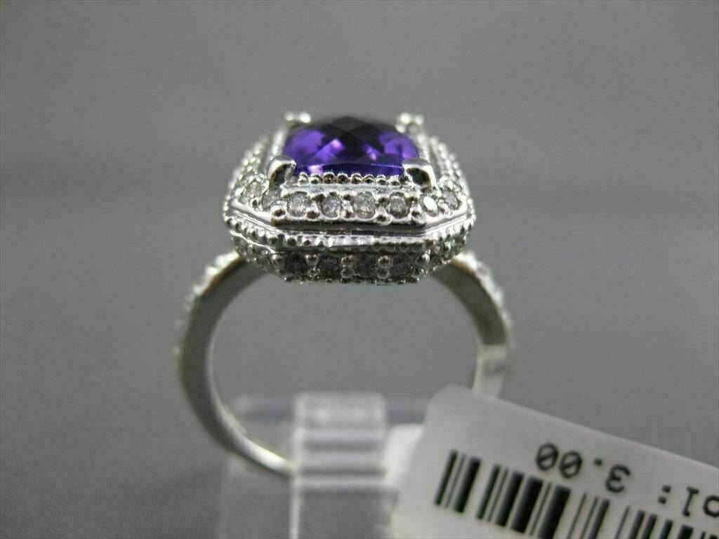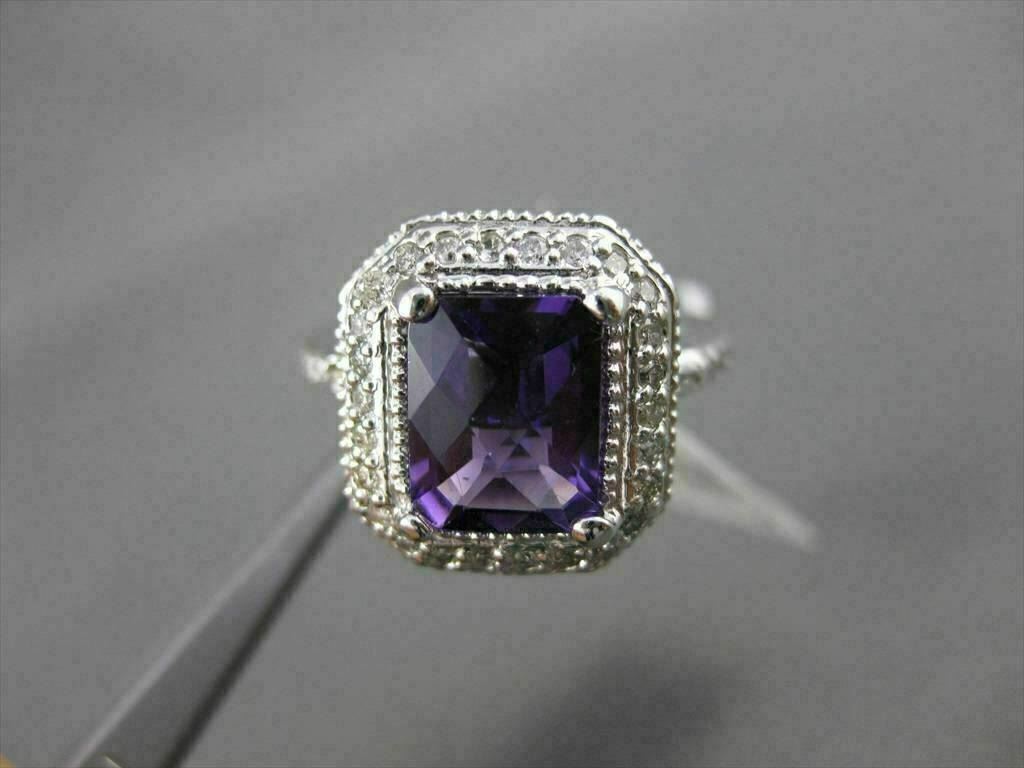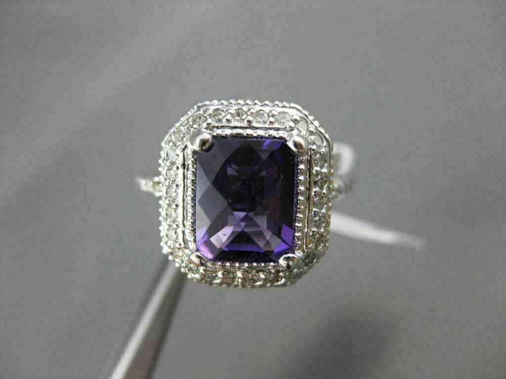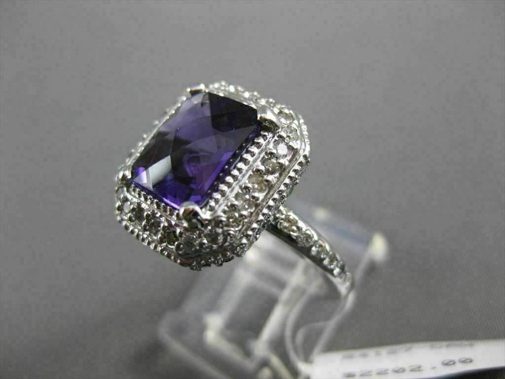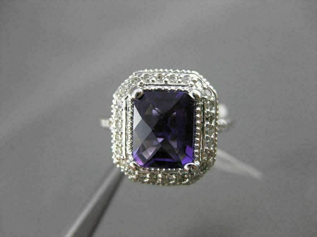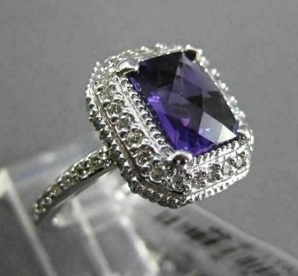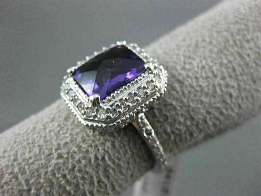 ESTATE LARGE 14KT WHITE GOLD RING. 3D HALO DESIGN. DIAMONDS ARE F/G COLOR, VSSI CLARITY, .70 CARATS. AAA AMETHYST IS 3.0 CARATS. MEASURES 8MM WIDE. THE RING SIZE IS 6.50. CAN BE SIZED BY OUR MASTER JEWELER. WRITTEN APPRAISAL AVAILABLE. COMES IN A PRESENTABLE GIFT BOX.