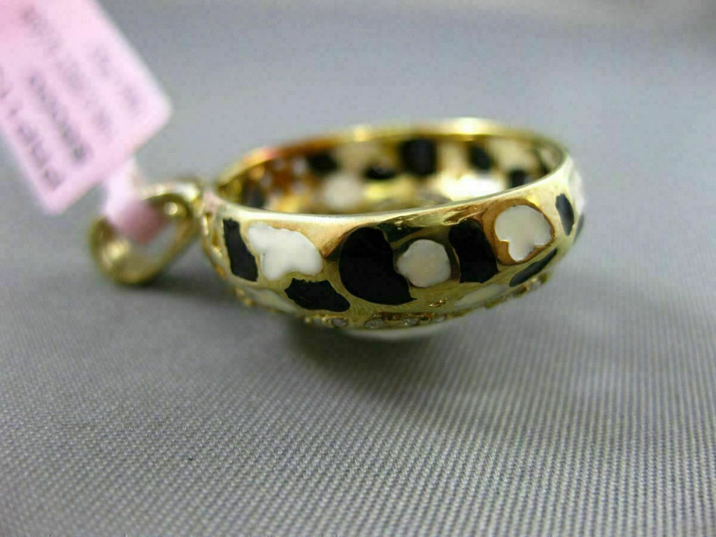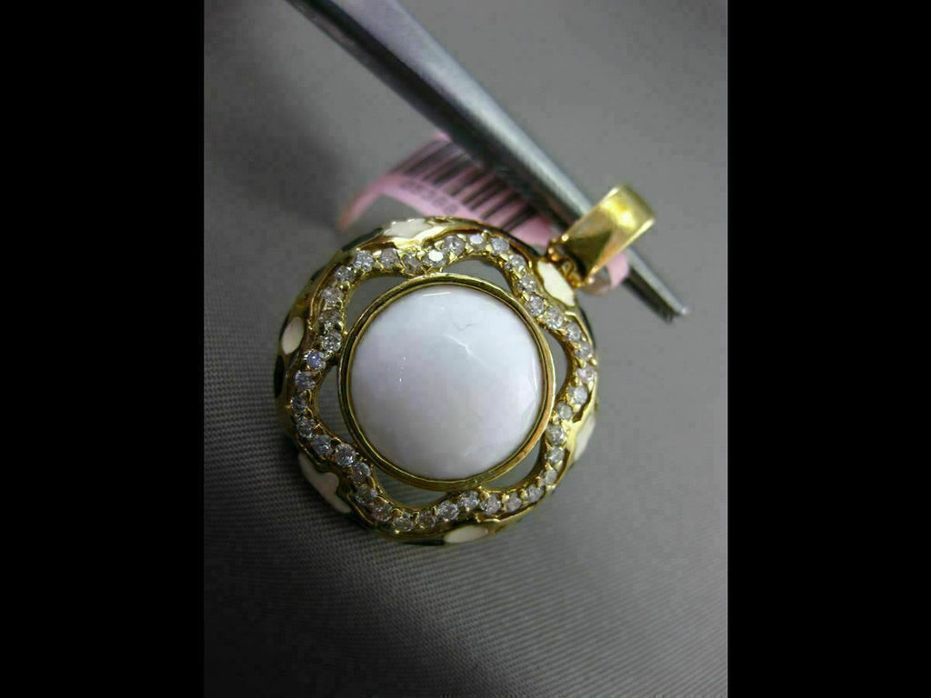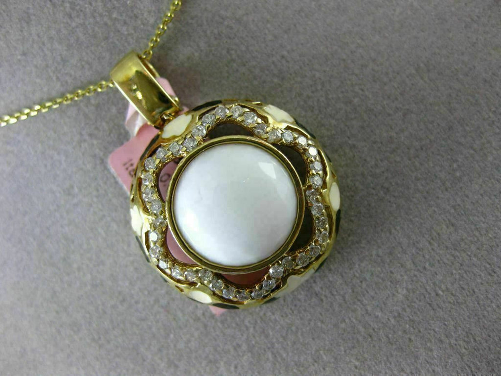 ESTATE LARGE 14KT YELLOW GOLD FLOATING PENDANT. 3D FLOWER ENAMEL ITALIAN DESIGN. DIAMOND ARE F/G COLOR, VSSI CLARITY .55 CARATS. CONSISTS OF ENAMEL AND AAA WHITE AGATE. MEASURES 31mm X 22mm WIDE. COMES ON A 14KT GOLD DIAMOND CUT 16" INCH CHAIN. WRITTEN APPRAISAL AVAILABLE. COMES IN A PRESENTABLE GIFT BOX.