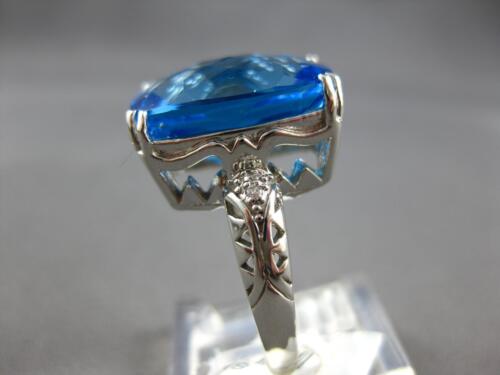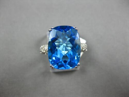 EXTRA LARGE 14KT WHITE GOLD FUN RING. 3D FILIGREE DESIGN. ROUND DIAMONDS ARE F/G COLOR, VSSI CLARITY .02 CARATS. AAA EXTRA FACETED CUSHION CUT BLUE TOPAZ IS 11.98 CARATS. MEASURES 16mm WIDE. RING SIZE 6.75. CAN BE SIZED BY OUR JEWELER UPON REQUEST. WRITTEN APPRAISAL AVAILABLE. COMES IN A PRESENTABLE GIFT BOX.