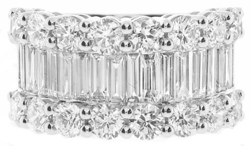 EXTRA LARGE 18KT WHITE GOLD ANNIVERSARY RING. 3D THREE ROW CLASSIC DESIGN. DIAMONDS ARE F/G COLOR, VSSI CLARITY. ROUND DIAMONDS ARE 2.73 CARATS. BAGUETTE DIAMONDS ARE 2.45 CARATS. RING SIZE 7. CAN BE SIZED BY OUR MASTER JEWELER UPON REQUEST. WRITTEN APPRAISAL AVAILABLE. COMES IN A PRESENTABLE GIFT BOX.