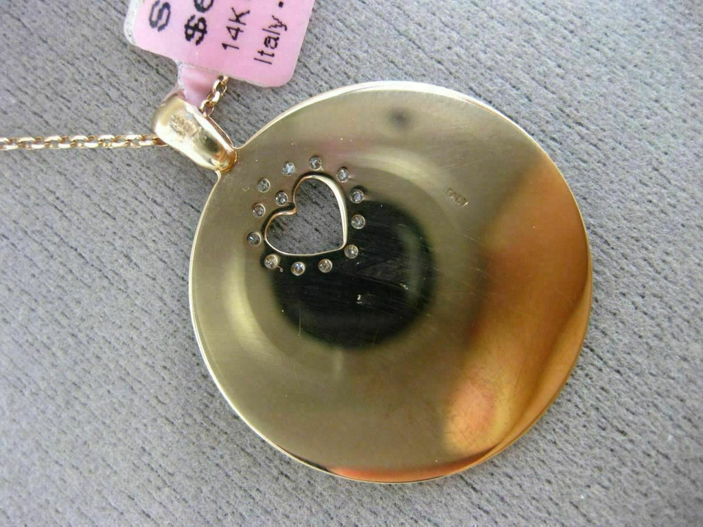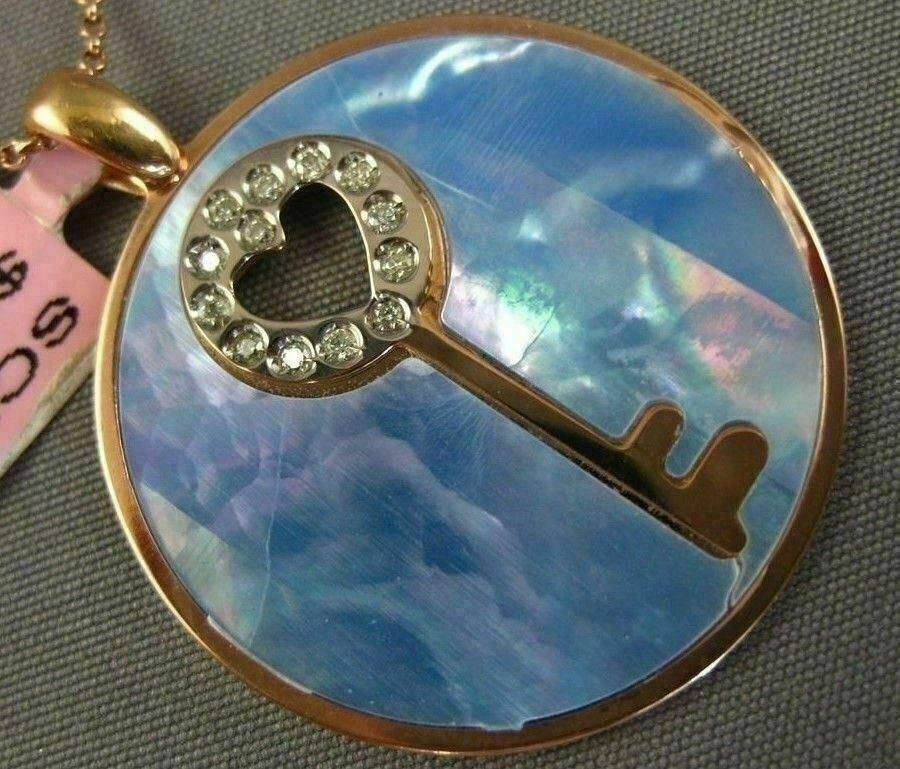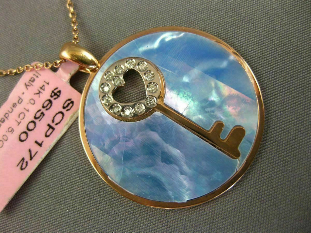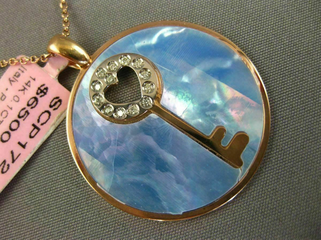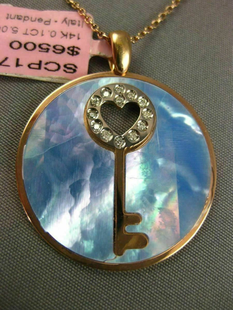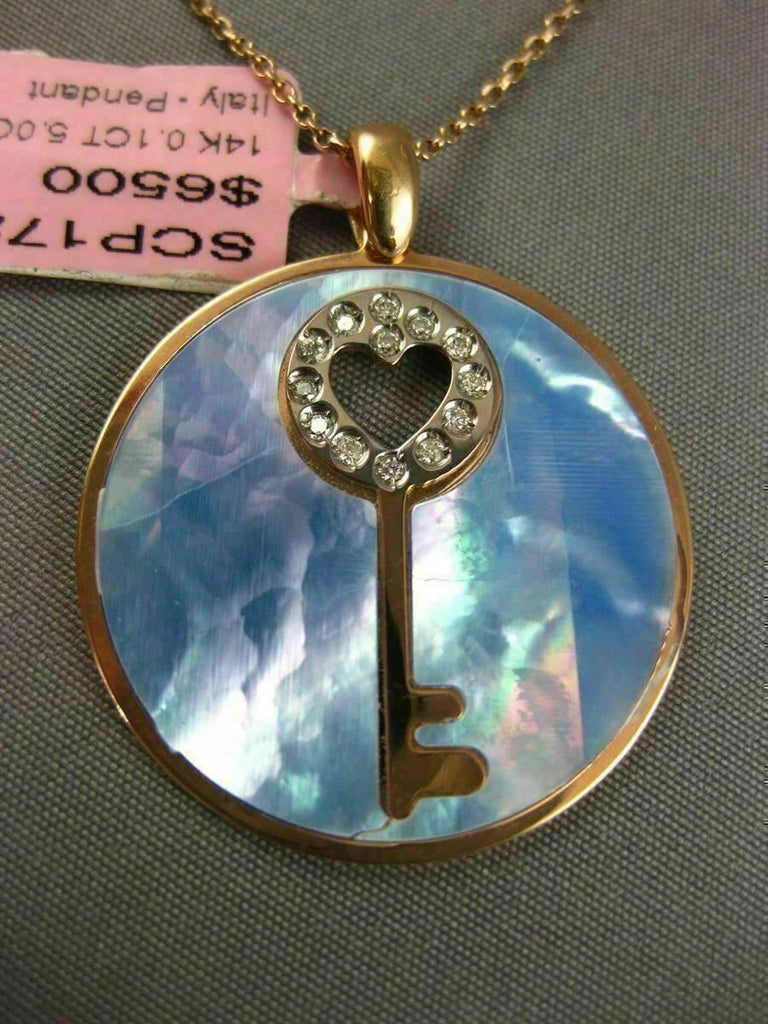 ESTATE LARGE 14KT ROSE GOLD FLOATING PENDANT. 3D KEY TO YOUR HEART CIRCULAR DESIGN. DIAMONDS ARE F/G COLOR, VSSI CLARITY .10 CARATS. FEATURES AAA BLUE MOTHER OF PEARL. MEASURES 32mm x 26mm. COMES ON A 14KT GOLD DIAMOND CUT 16" INCH CHAIN. WRITTEN APPRAISAL AVAILABLE. COMES IN A PRESENTABLE GIFT BOX