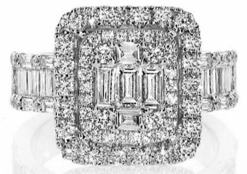 LARGE 18KT WHITE GOLD ENGAGEMENT RING. 3D CLUSTER SQUARE HALO DESIGN. DIAMONDS ARE F/G COLOR, VSSI CLARITY. ROUND DIAMONDS ARE .82 CARATS. BAGUETTE DIAMONDS ARE 1.26 CARATS. RING SIZE 7. CAN BE SIZED BY OUR MASTER JEWELER UPON REQUEST. WRITTEN APPRAISAL AVAILABLE. COMES IN A PRESENTABLE GIFT BOX.