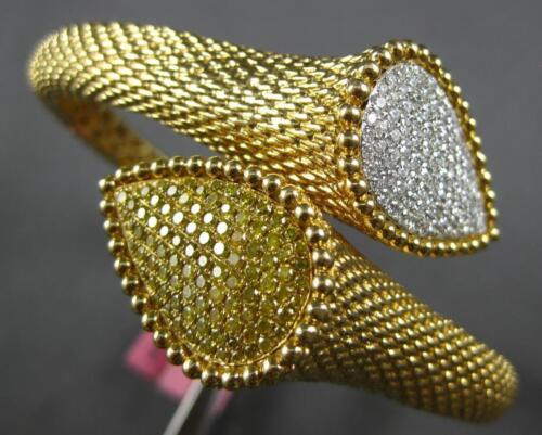 EXTRA LARGE 18KT YELLOW GOLD CUFF BANGLE BRACELET. 3D CRISS CROSS SNAKE FILIGREE DESIGN. WHITE DIAMONDS ARE F/G COLOR, VVS-VS CLARITY 1.05 CARATS. INTENSE YELLOW DIAMONDS ARE 1.16 CARATS. MEASURES 36mm X 68mm X 68mm. FITS UP TO 7" INCH WRIST. WRITTEN APPRAISAL AVAILABLE. COMES IN A PRESENTABLE GIFT BOX.