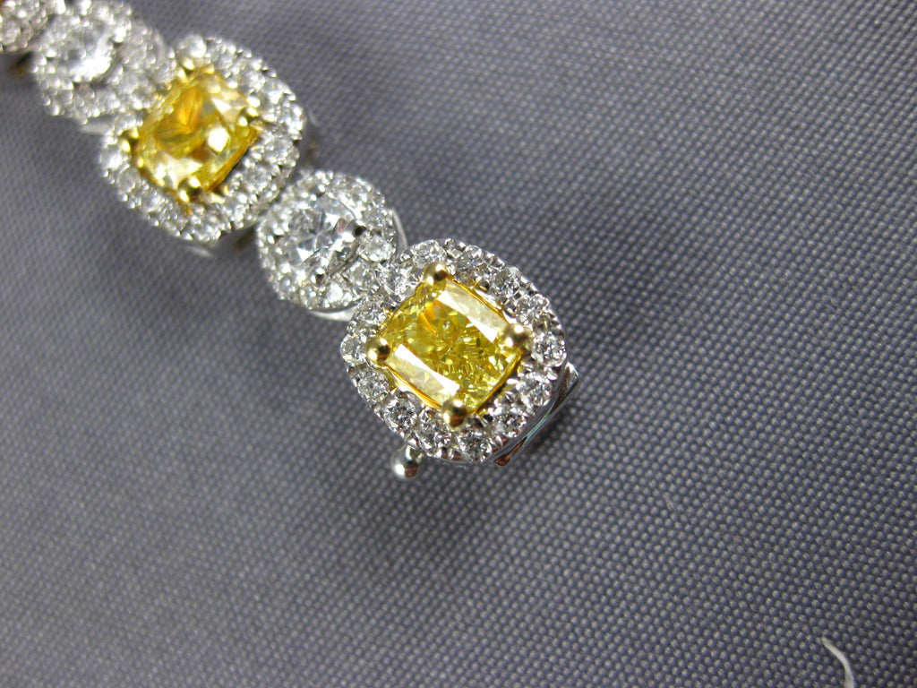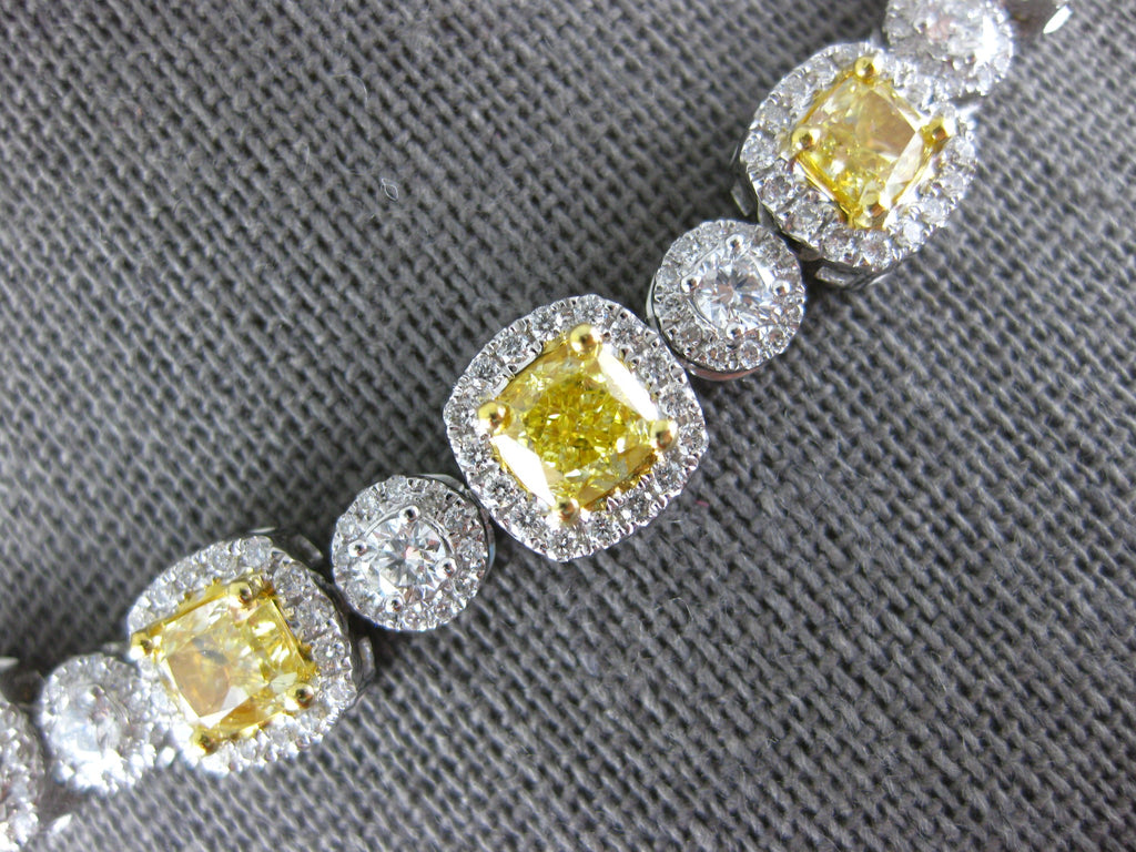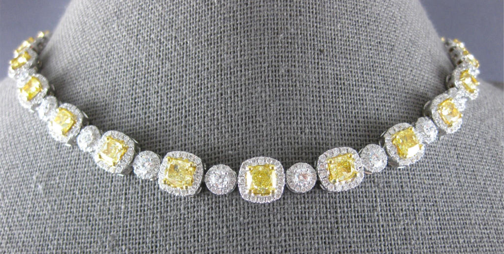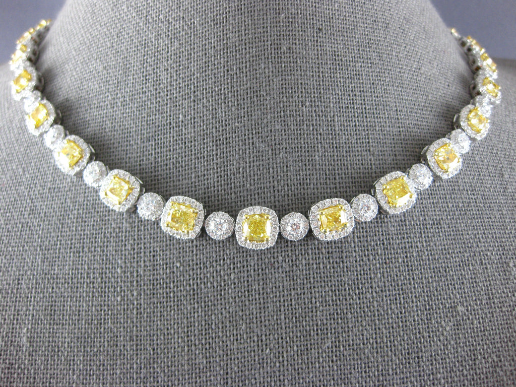 LARGE 18KT WHITE AND YELLOW GOLD TENNIS NECKLACE. 3D CLASSIC DESIGN. ROUND WHITE DIAMONDS ARE F/G COLOR, VS CLARITY 7.78 CARATS. CUSHION CUT FANCY YELLOW DIAMONDS ARE 17.08 CARATS. MEASURES 8mm WIDE. 17" INCHES LONG. WRITTEN APPRAISAL AVAILABLE. COMES IN A PRESENTABLE GIFT BOX.