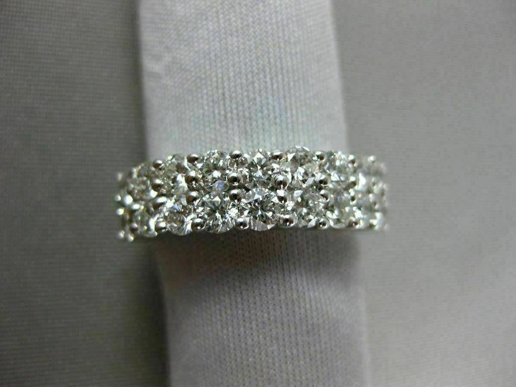 WIDE 18KT WHITE GOLD WEDDING ANNIVERSARY RING. 3D DOUBLE ROW SEMI ETERNITY DESIGN. DIAMONDS ARE F/G COLOR, VSSI CLARITY 1.40 CARATS. MEASURES 5mm WIDE. RING SIZE 6.25. CAN BE SIZED BY OUR MASTER JEWELER UPON REQUEST. WRITTEN APPRAISAL AVAILABLE. COMES IN A PRESENTABLE GIFT BOX